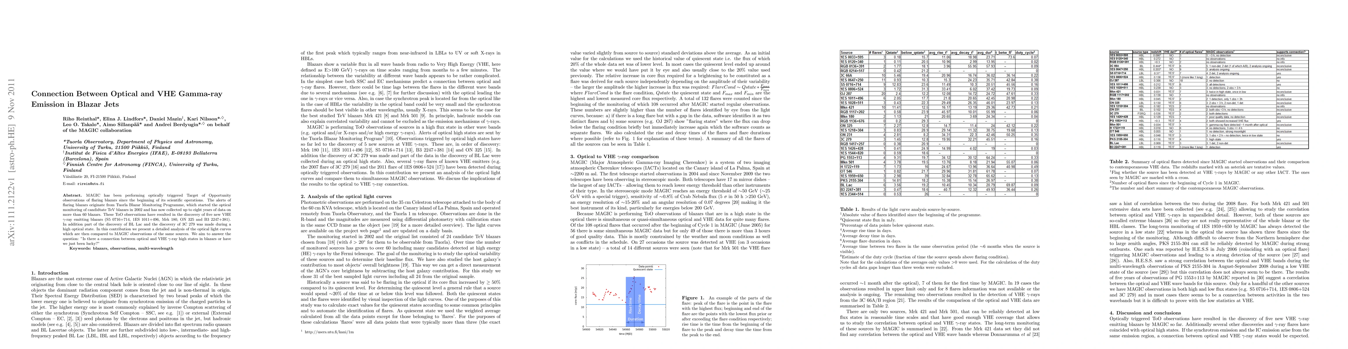 MAGIC has been performing optically triggered Target of Opportunity observations of flaring blazars since the beginning of its scientific operations. The alerts of flaring blazars originate from Tuorla Blazar Monitoring Programme, which started the optical monitoring of candidtate TeV blazars in 2002 and has now collected up to eight years of data on more than 60 blazars. These ToO observations have resulted in the discovery of five new VHE gamma-ray emitting blazars (S5 0716+714, 1ES 1011+496, Mrk 180, ON 325 and B3 2247+381). In addition part of the discovery of BL Lac and the discovery of 3C 279 was made during a high optical state. In this contribution we present a detailed analysis of the optical light curves which are then compared to MAGIC observations of the same sources. We aim to answer the question: "Is there a connection between optical and VHE -ray high states in blazars or have we just been lucky?"