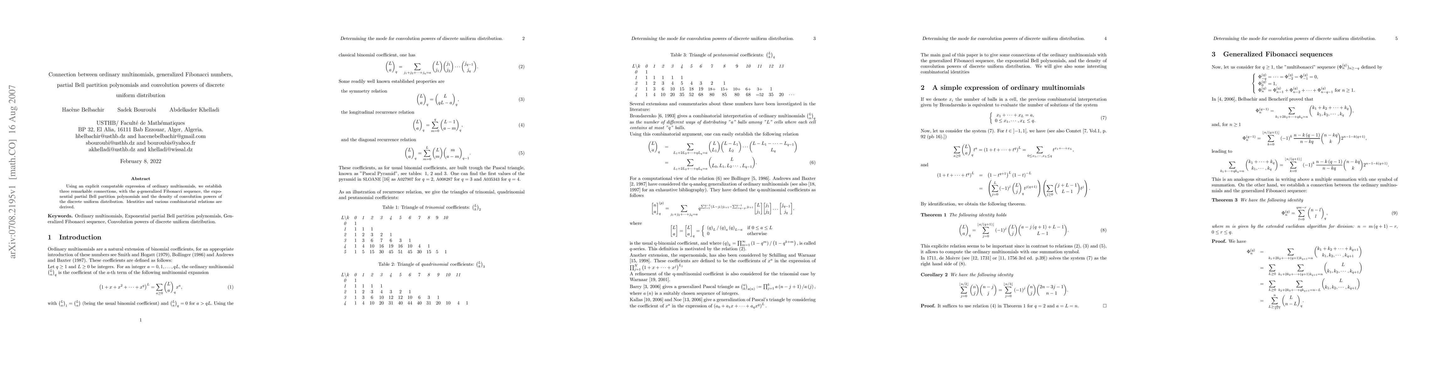 Using an explicit computable expression of ordinary multinomials, we establish three remarkable connections, with the q-generalized Fibonacci sequence, the exponential partial Bell partition polynomials and the density of convolution powers of the discrete uniform distribution. Identities and various combinatorial relations are derived.