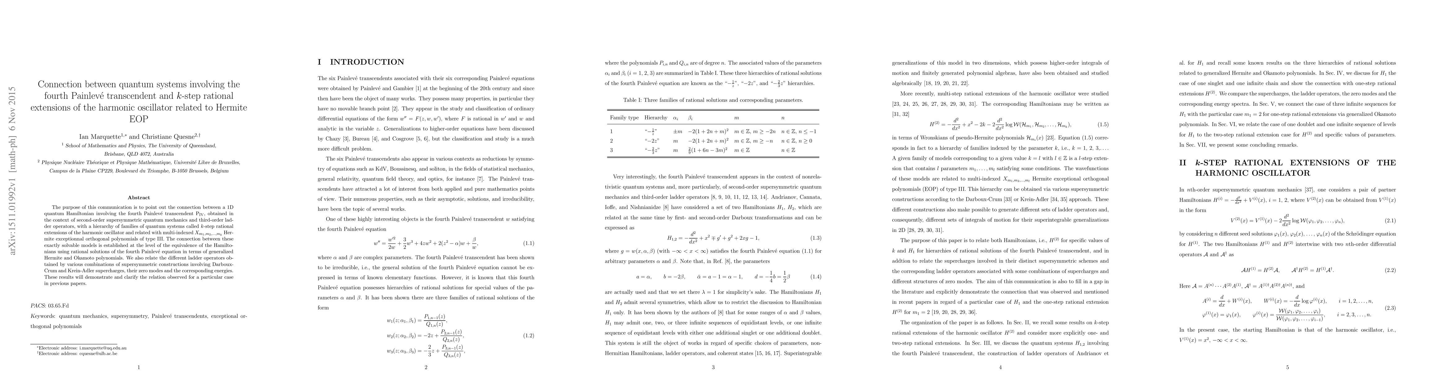 The purpose of this communication is to point out the connection between a 1D quantum Hamiltonian involving the fourth Painleve transcendent P$_{\rm IV}$, obtained in the context of second-order supersymmetric quantum mechanics and third-order ladder operators, with a hierarchy of families of quantum systems called $k$-step rational extensions of the harmonic oscillator and related with multi-indexed $X_{m_{1},m_{2},...,m_{k}}$ Hermite exceptionnal orthogonal polynomials of type III. The connection between these exactly solvable models is established at the level of the equivalence of the Hamiltonians using rational solutions of the fourth Painleve equation in terms of generalized Hermite and Okamoto polynomials. We also relate the different ladder operators obtained by various combinations of supersymmetric constructions involving Darboux-Crum and Krein-Adler supercharges, their zero modes and the corresponding energies. These results will demonstrate and clarify the relation observed for a particular case in previous papers.