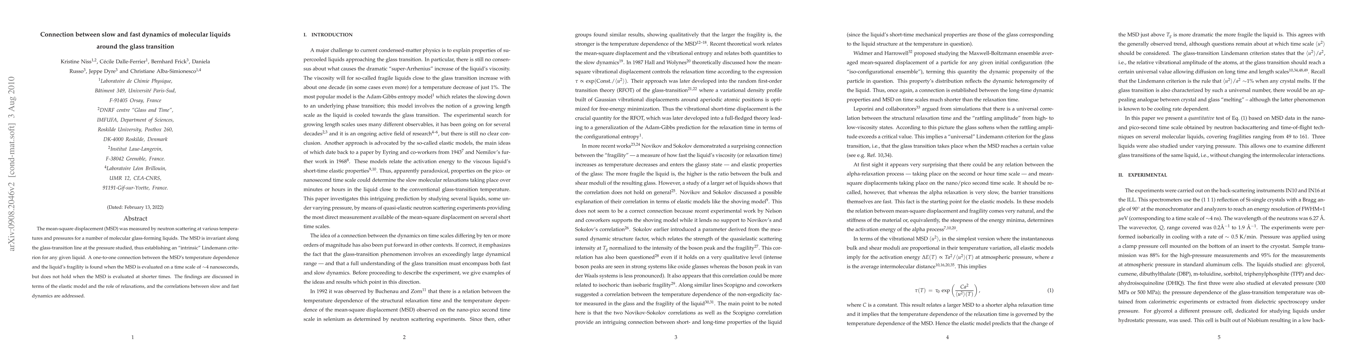 This paper investigates the relationship between slow and fast dynamics in molecular liquids near the glass transition using neutron scattering. The study finds an intrinsic Lindemann criterion invariant along the glass-transition line, and reveals a direct correlation between mean-square displacement at 4 nanoseconds and liquid fragility, but not at shorter timescales.