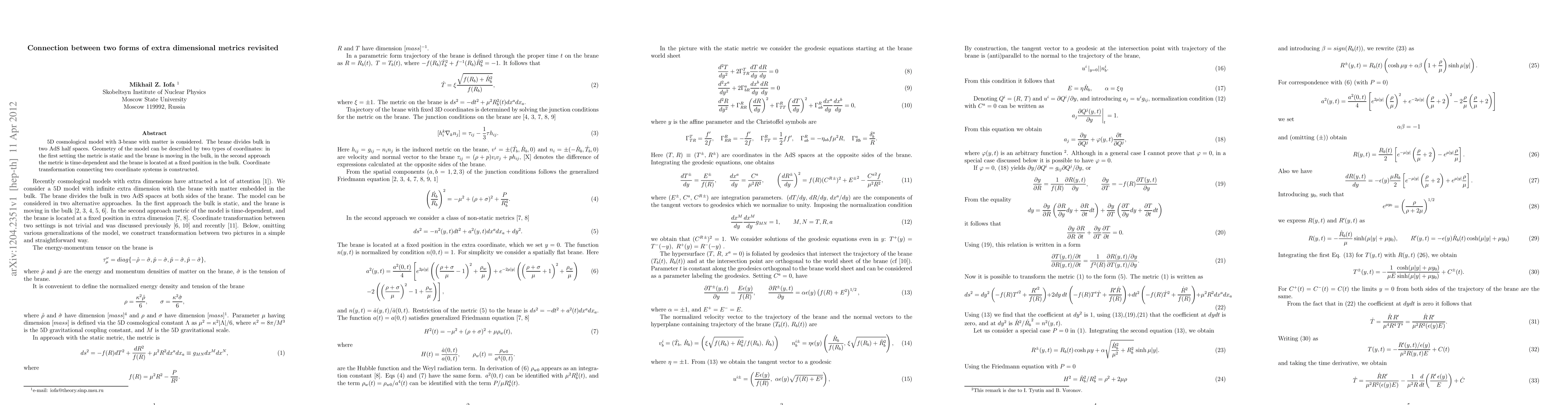 5D cosmological model with 3-brane with matter is considered. The brane divides bulk in two AdS half spaces. Geometry of the model can be described by two types of coordinates: in the first setting the metric is static and the brane is moving in the bulk, in the second approach the metric is time-dependent and the brane is located at a fixed position in the bulk. Coordinate transformation connecting two coordinate systems is constructed.
