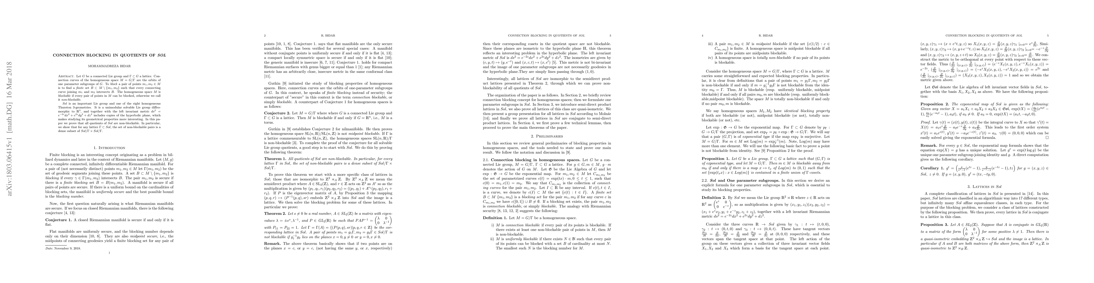 Let $G$ be a connected Lie group and $\Gamma \subset G$ a lattice. Connection curves of the homogeneous space $M=G/\Gamma$ are the orbits of one parameter subgroups of $G$. To $block$ a pair of points $m_1,m_2 \in M$ is to find a finite set $B \subset M\setminus \{m_1, m_2 \}$ such that every connecting curve joining $m_1$ and $m_2$ intersects $B$. The homogeneous space $M$ is $blockable$ if every pair of points in $M$ can be blocked, otherwise we call it $non-blockable$. $Sol$ is an important Lie group and one of the eight homogeneous Thurston 3-geometries. It is a unimodular solvable Lie group diffeomorphic to $R^3$, and together with the left invariant metric $ds^2=e^{-2z}dx^2+e^{2z}dy^2+dz^2$ includes copies of the hyperbolic plane, which makes studying its geometrical properties more interesting. In this paper we prove that all quotients of $Sol$ are non-blockable. In particular, we show that for any lattice $\Gamma \subset Sol$, the set of non-blockable pairs is a dense subset of $Sol/\Gamma \times Sol/\Gamma$.