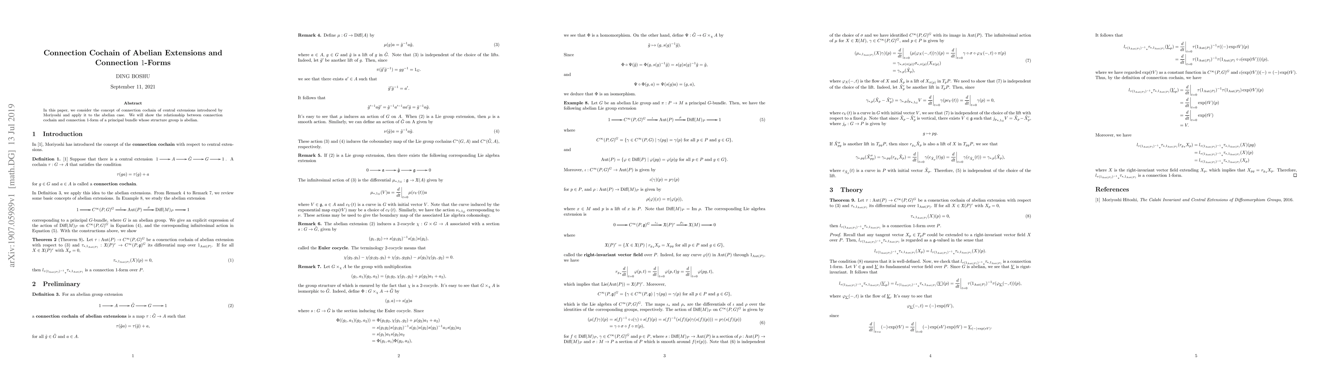 In this paper, we consider the concept of connection cochain of central extensions introduced by Moriyoshi and apply it to the abelian case. We will show the relationship between connection cochain and connection $1$-form of a principal bundle whose structure group is abelian.