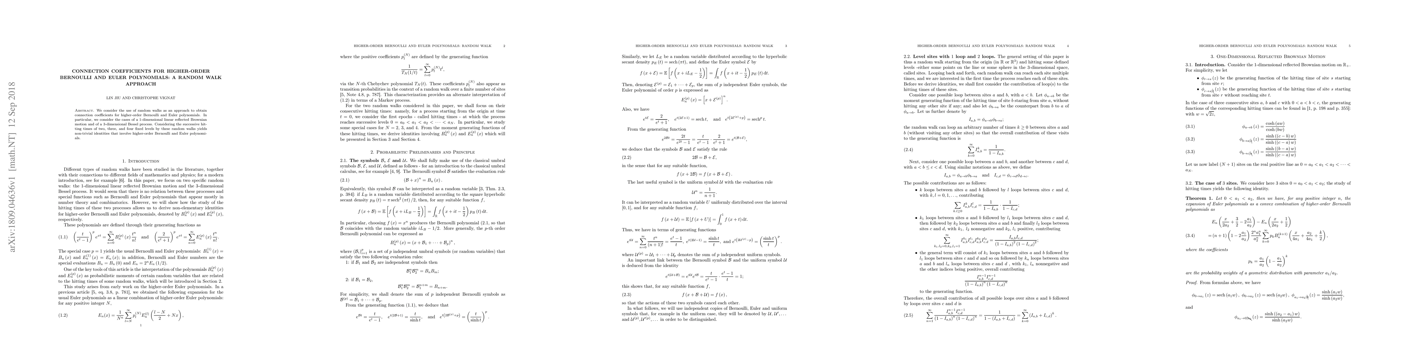 This paper explores the use of random walks, specifically $1$-dimensional linear reflected Brownian motion and $3$-dimensional Bessel process, to derive connection coefficients for higher-order Bernoulli and Euler polynomials. The study reveals non-trivial identities involving these polynomials through the analysis of hitting times at multiple levels.