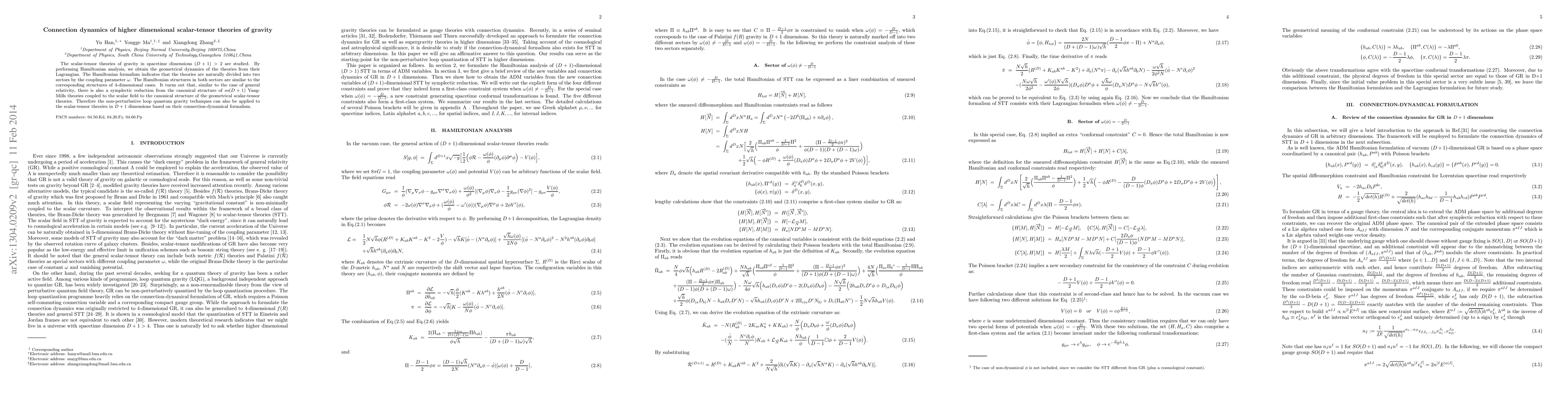 This paper studies scalar-tensor theories of gravity in higher dimensions ($D+1>2$) using Hamiltonian analysis, revealing a division into two sectors based on the coupling parameter $\omega$. The research demonstrates a symplectic reduction from $so(D+1)$ Yang-Mills theories to geometrical scalar-tensor theories, enabling the application of non-perturbative loop quantum gravity techniques.