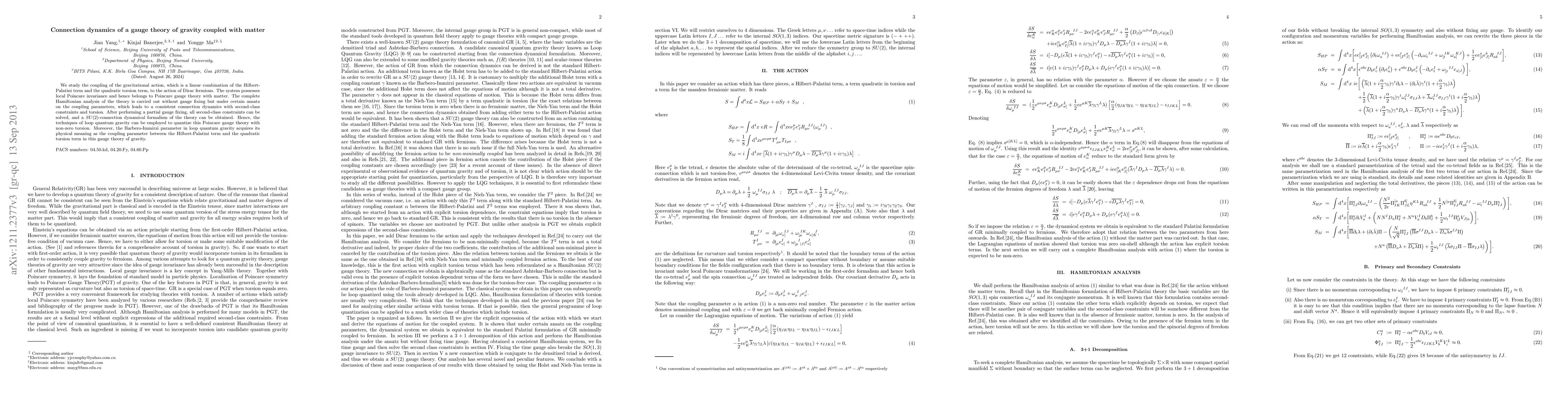 We study the coupling of the gravitational action, which is a linear combination of the Hilbert-Palatini term and the quadratic torsion term, to the action of Dirac fermions. The system possesses local Poincare invariance and hence belongs to Poincare gauge theory with matter. The complete Hamiltonian analysis of the theory is carried out without gauge fixing but under certain ansatz on the coupling parameters, which leads to a consistent connection dynamics with second-class constraints and torsion. After performing a partial gauge fixing, all second-class constraints can be solved, and a SU(2)-connection dynamical formalism of the theory can be obtained. Hence, the techniques of loop quantum gravity can be employed to quantize this Poincare gauge theory with non-zero torsion. Moreover, the Barbero-Immirzi parameter in loop quantum gravity acquires its physical meaning as the coupling parameter between the Hilbert-Palatini term and the quadratic torsion term in this gauge theory of gravity.