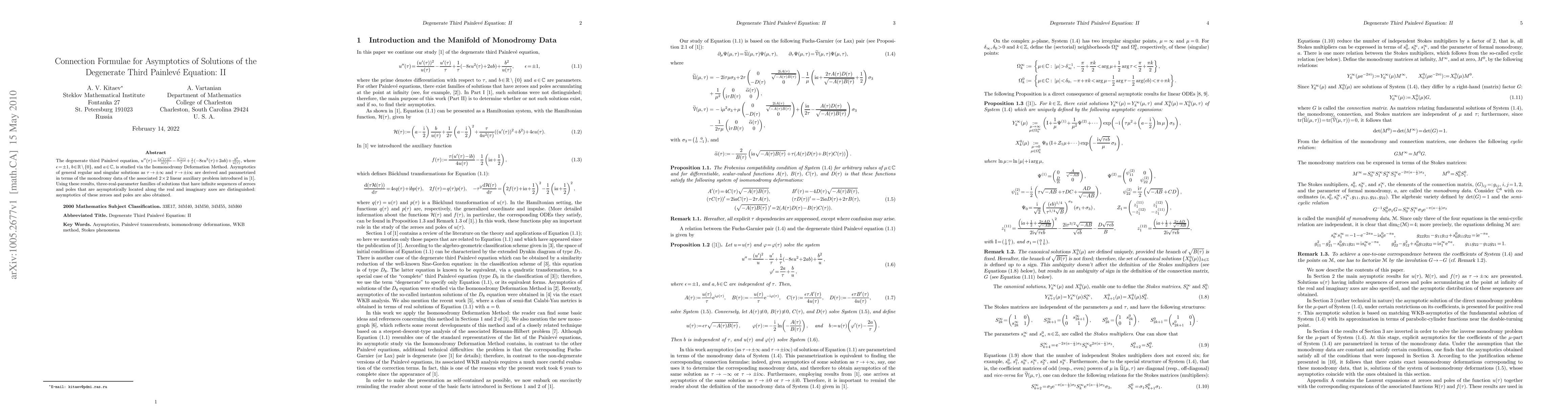 This paper studies the degenerate third Painleve' equation using the Isomonodromy Deformation Method to derive and parameterize the asymptotics of its solutions. It identifies three-parameter families of solutions with zeroes and poles along the real and imaginary axes, and provides their asymptotic behaviors.
