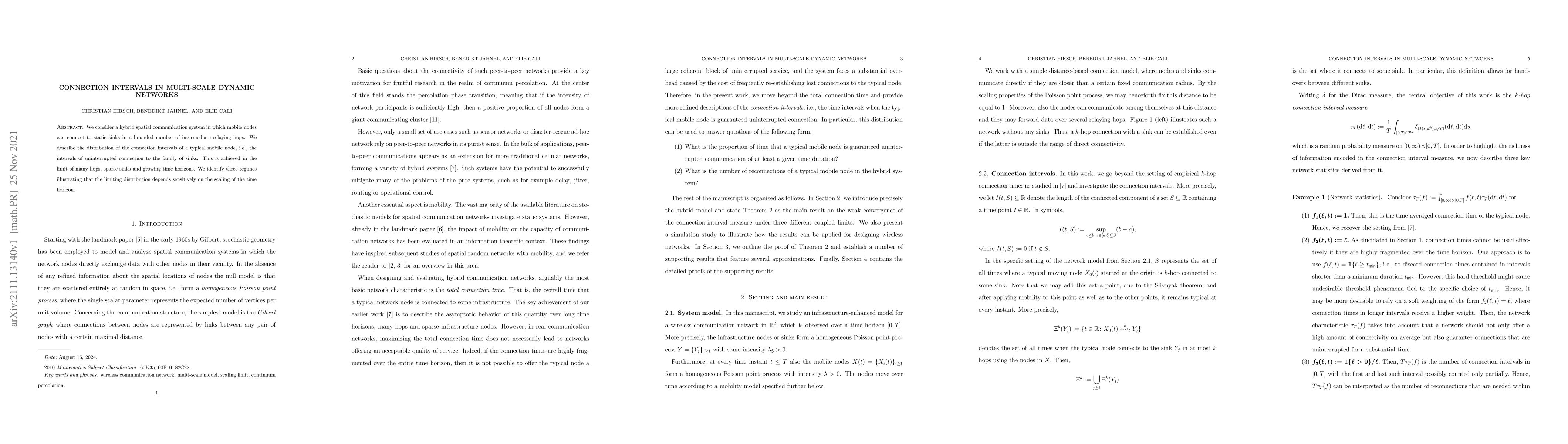 We consider a hybrid spatial communication system in which mobile nodes can connect to static sinks in a bounded number of intermediate relaying hops. We describe the distribution of the connection intervals of a typical mobile node, i.e., the intervals of uninterrupted connection to the family of sinks. This is achieved in the limit of many hops, sparse sinks and growing time horizons. We identify three regimes illustrating that the limiting distribution depends sensitively on the scaling of the time horizon.