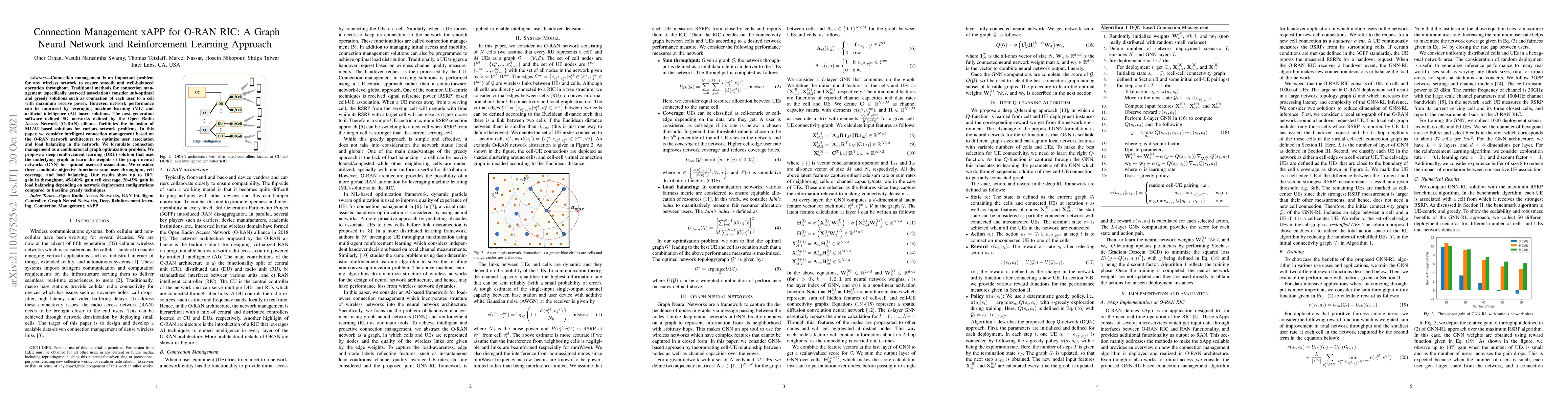Connection management is an important problem for any wireless network to ensure smooth and well-balanced operation throughout. Traditional methods for connection management (specifically user-cell association) consider sub-optimal and greedy solutions such as connection of each user to a cell with maximum receive power. However, network performance can be improved by leveraging machine learning (ML) and artificial intelligence (AI) based solutions. The next generation software defined 5G networks defined by the Open Radio Access Network (O-RAN) alliance facilitates the inclusion of ML/AI based solutions for various network problems. In this paper, we consider intelligent connection management based on the O-RAN network architecture to optimize user association and load balancing in the network. We formulate connection management as a combinatorial graph optimization problem. We propose a deep reinforcement learning (DRL) solution that uses the underlying graph to learn the weights of the graph neural networks (GNN) for optimal user-cell association. We consider three candidate objective functions: sum user throughput, cell coverage, and load balancing. Our results show up to 10% gain in throughput, 45-140% gain cell coverage, 20-45% gain in load balancing depending on network deployment configurations compared to baseline greedy techniques.