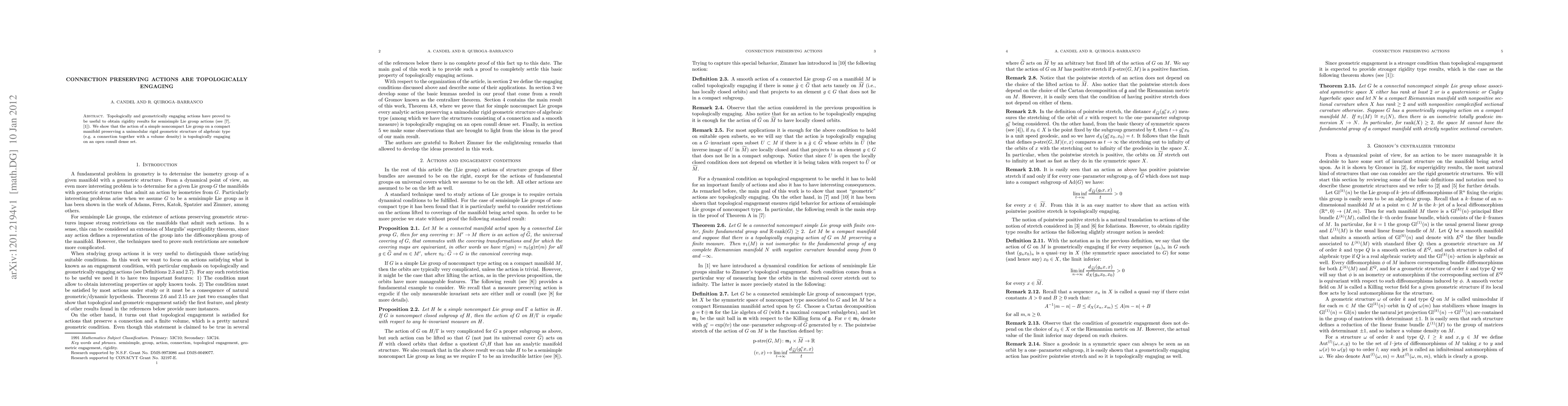 Summary: The paper demonstrates that actions of simple noncompact Lie groups preserving a unimodular rigid geometric structure on compact manifolds are topologically engaging on an open, dense subset, contributing to the understanding of rigidity results for such group actions.