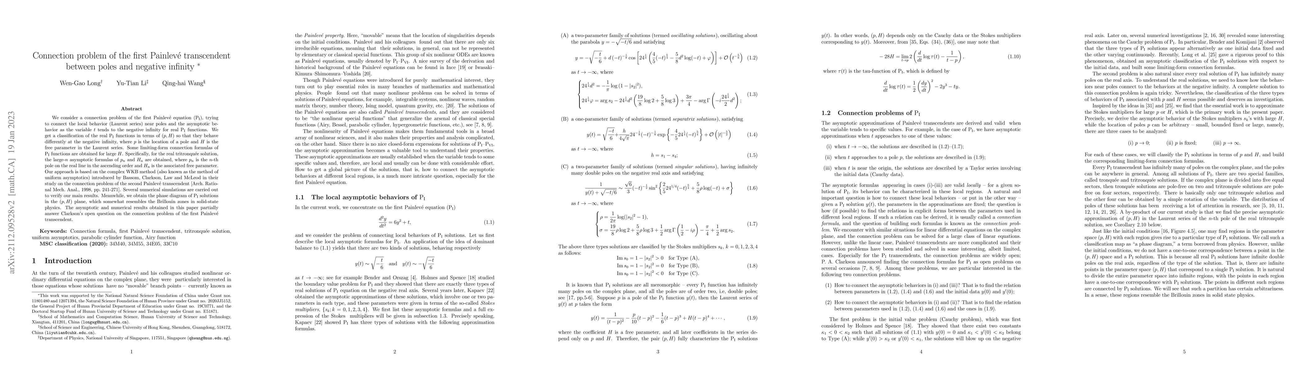 This paper investigates the connection problem of the first Painlevé equation ($\mathrm{P_I}$), classifying real $\mathrm{P_I}$ functions based on their behavior near poles and at negative infinity. It employs the complex WKB method to derive asymptotic formulas and verifies results through numerical simulations, partially addressing Clarkson's open question on the connection problem.