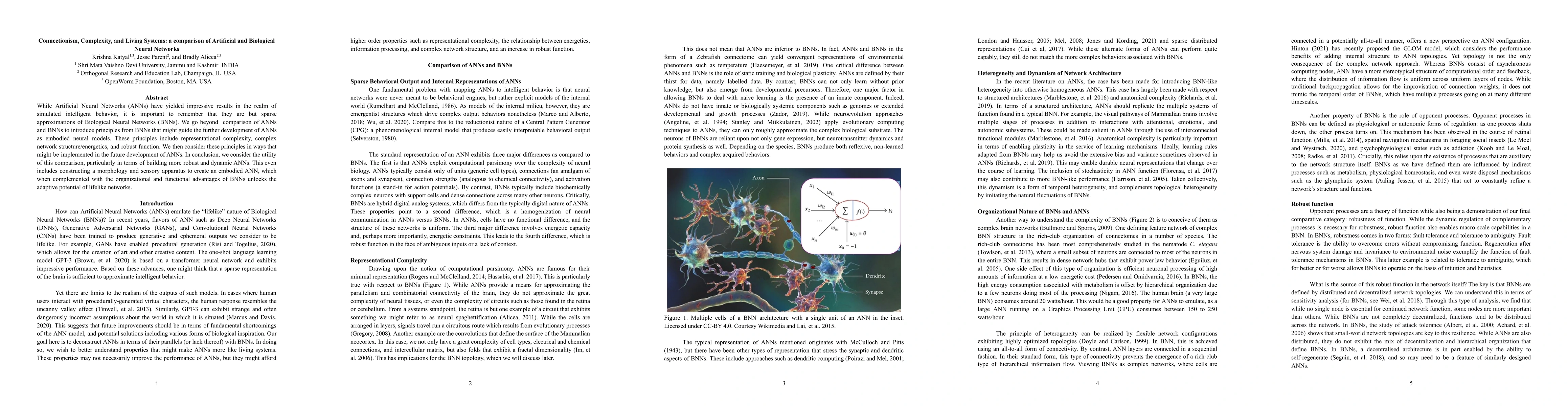 While Artificial Neural Networks (ANNs) have yielded impressive results in the realm of simulated intelligent behavior, it is important to remember that they are but sparse approximations of Biological Neural Networks (BNNs). We go beyond comparison of ANNs and BNNs to introduce principles from BNNs that might guide the further development of ANNs as embodied neural models. These principles include representational complexity, complex network structure/energetics, and robust function. We then consider these principles in ways that might be implemented in the future development of ANNs. In conclusion, we consider the utility of this comparison, particularly in terms of building more robust and dynamic ANNs. This even includes constructing a morphology and sensory apparatus to create an embodied ANN, which when complemented with the organizational and functional advantages of BNNs unlocks the adaptive potential of lifelike networks.