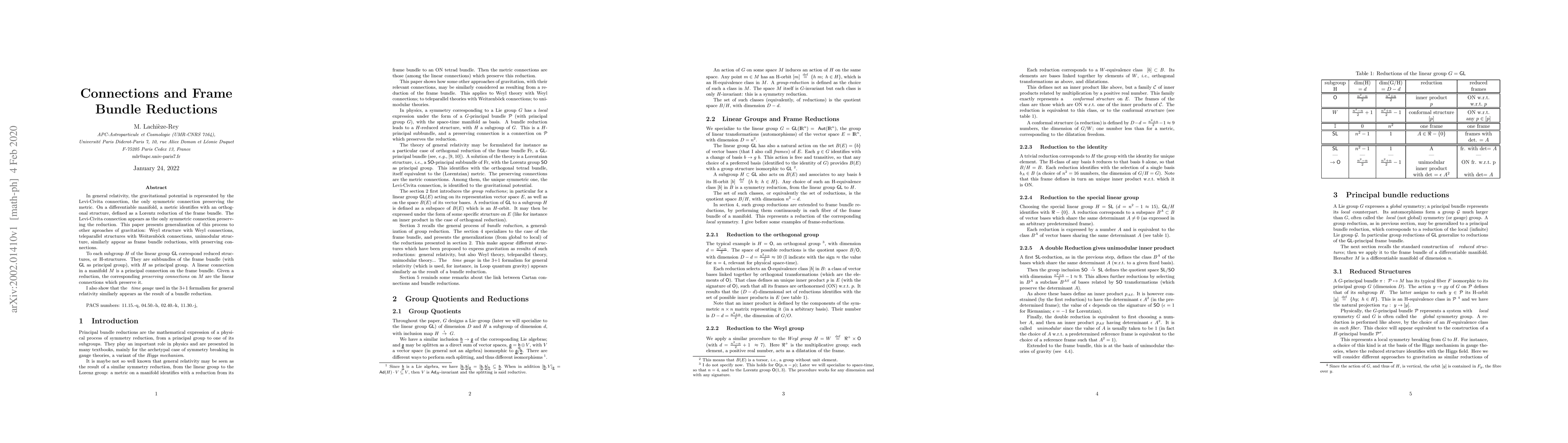 In general relativity, the gravitational potential is represented by the Levi-Civita connection, the only symmetric connection preserving the metric. On a differentiable manifold, a metric identifies with an orthogonal structure, defined as a Lorentz reduction of the frame bundle. The Levi-Civita connection appears as the only symmetric connection preserving the reduction. This paper presents generalization of this process to other aproaches of gravitation: Weyl structure with Weyl connections, teleparallel structures with Weitzenbock connections, unimodular structure, similarly appear as frame bundle reductions, with preserving connections. To each subgroup H of the linear group GL correspond reduced structures, or H-structures. They are subbundles of the frame bundle (with GL as principal group), with H as principal group. A linear connection in a manifold M is a principal connection on the frame bundle. Given a reduction, the corresponding preserving connections on M are the linear connections which preserve it. I also show that the time gauge used in the 3+1 formalism for general relativity similarly appears as the result of a bundle reduction.