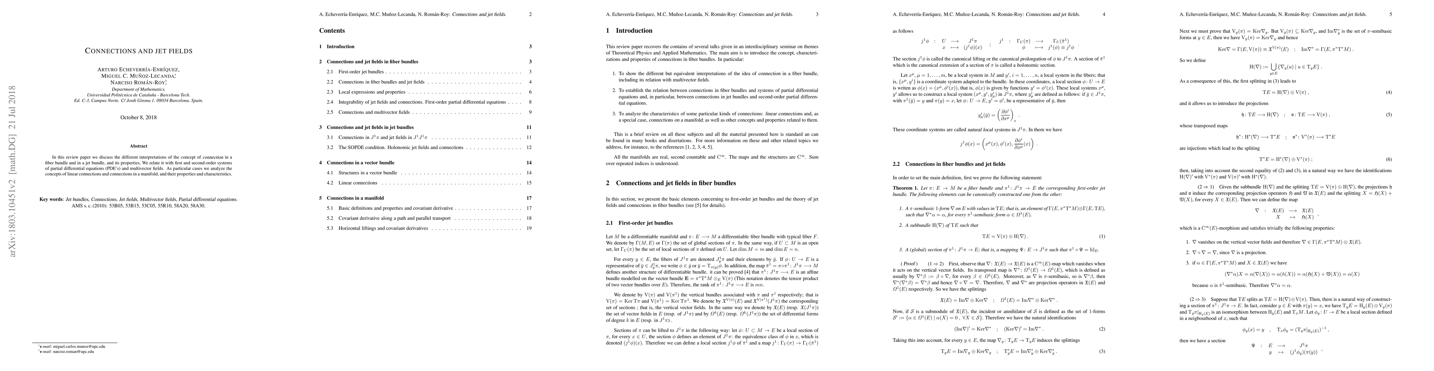 This review paper explores connections in fiber bundles and jet fields, relating them to partial differential equations and multivector fields, with a focus on linear connections and manifold connections.