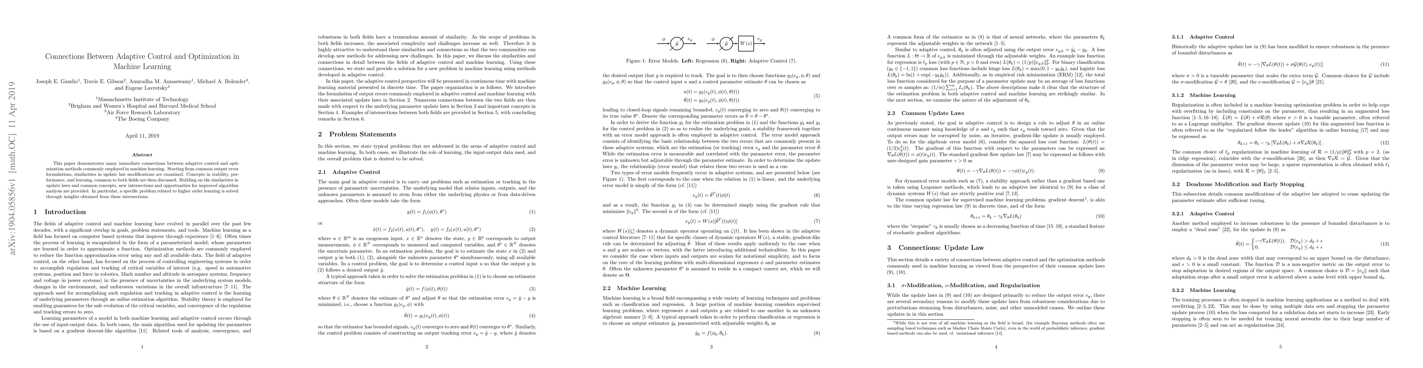 The paper explores connections between adaptive control and optimization methods used in machine learning, revealing similarities in update laws and common concepts such as stability and performance.