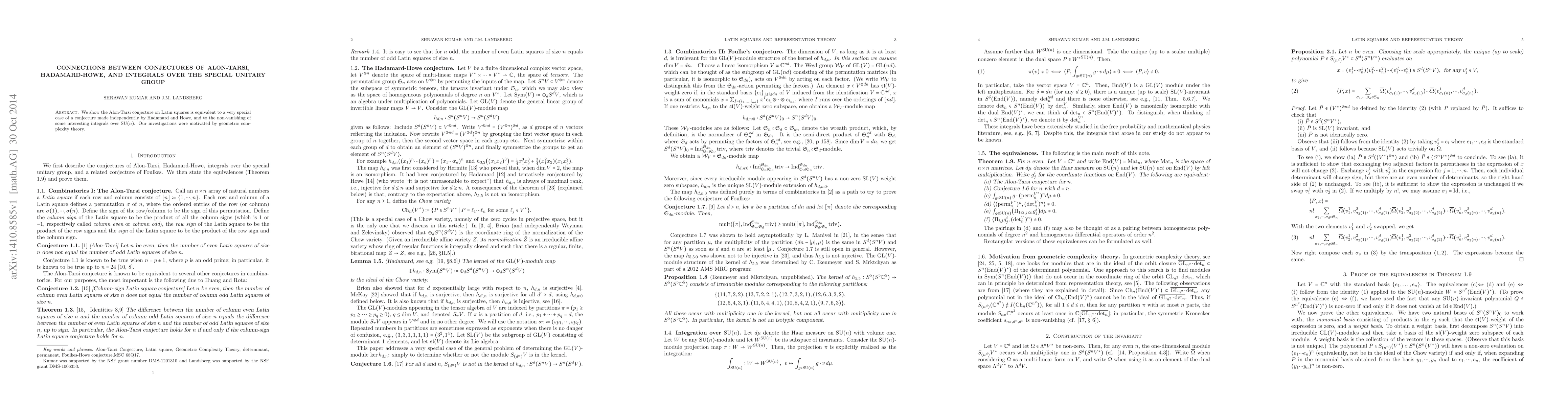 This paper demonstrates equivalences between the Alon-Tarsi conjecture in Latin squares, a Hadamard-Howe conjecture, and non-vanishing integrals over the special unitary group SU(n). The research was inspired by geometric complexity theory.