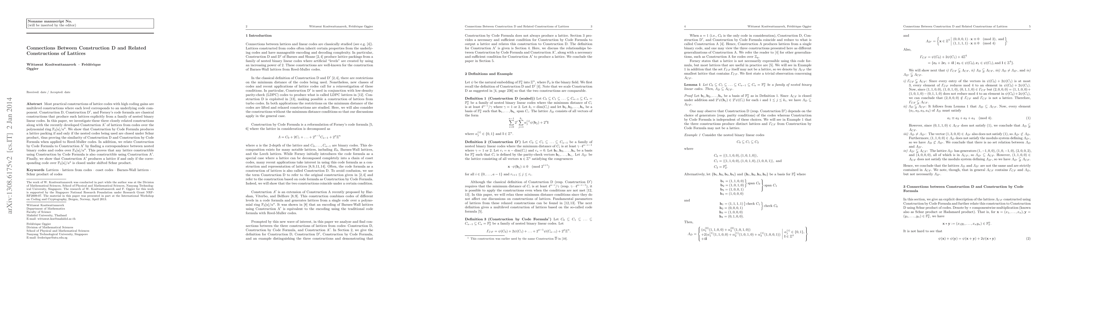 This paper investigates the relationships between Construction D, Construction D$'$, Forney's code formula, and Construction A$'$, showing that Construction by Code Formula produces a lattice packing if nested codes are closed under Schur product, and that Construction A$'$ is equivalent to Construction by Code Formula for lattice constructions.