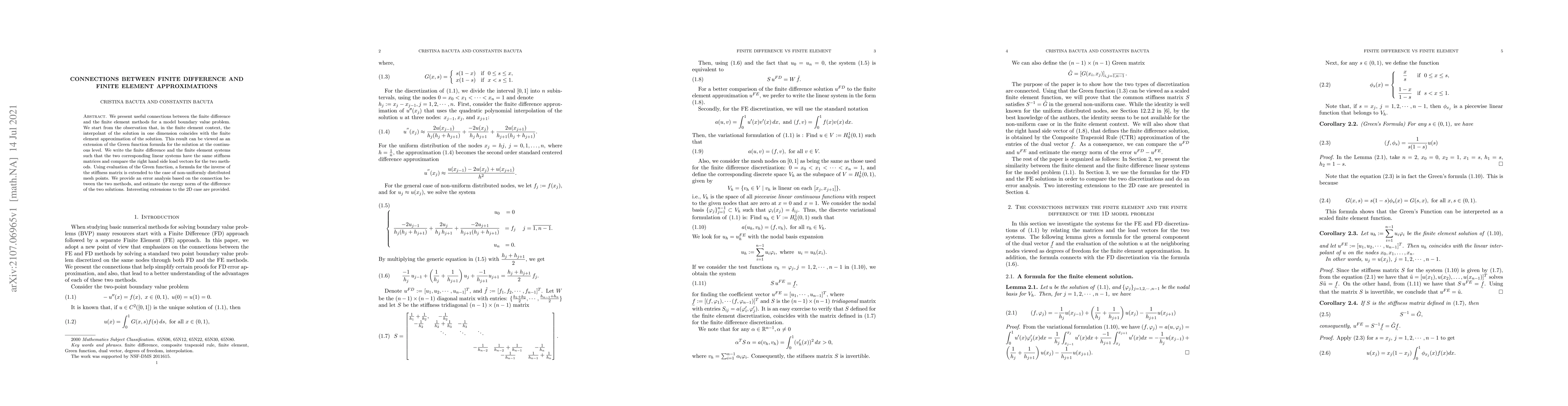 This paper establishes connections between finite difference and finite element methods for a boundary value problem, showing that the 1D interpolant in finite elements matches the finite difference solution. It extends the Green function formula and analyzes the error norm of the difference between the two methods, providing insights into their relationship and extending the findings to 2D cases.