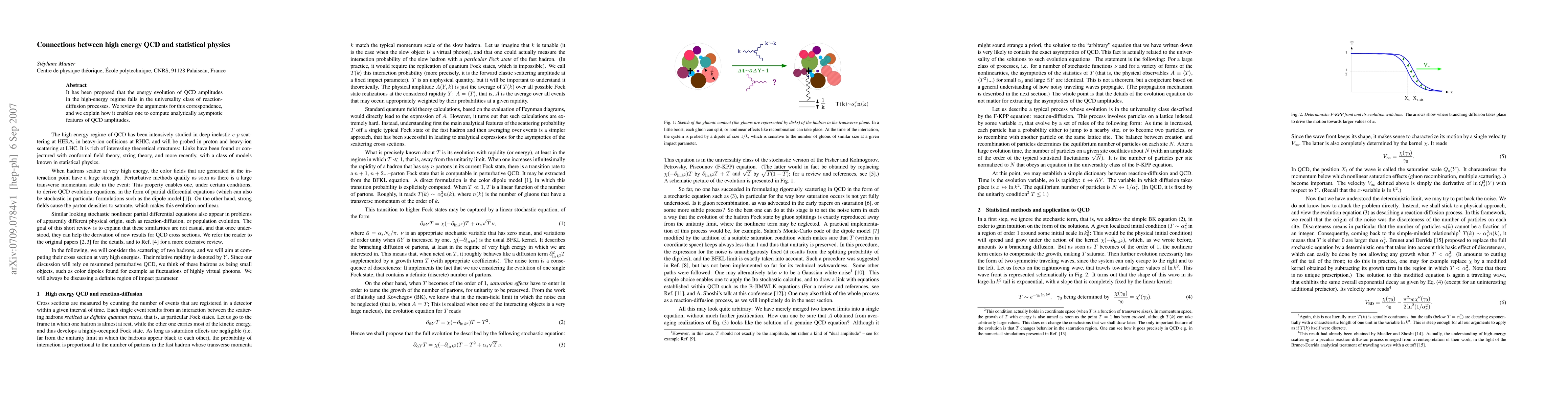 This paper explores the connection between high energy QCD amplitudes and reaction-diffusion processes in statistical physics, proposing that their energy evolution shares a universality class, which facilitates the analytical computation of asymptotic QCD features.