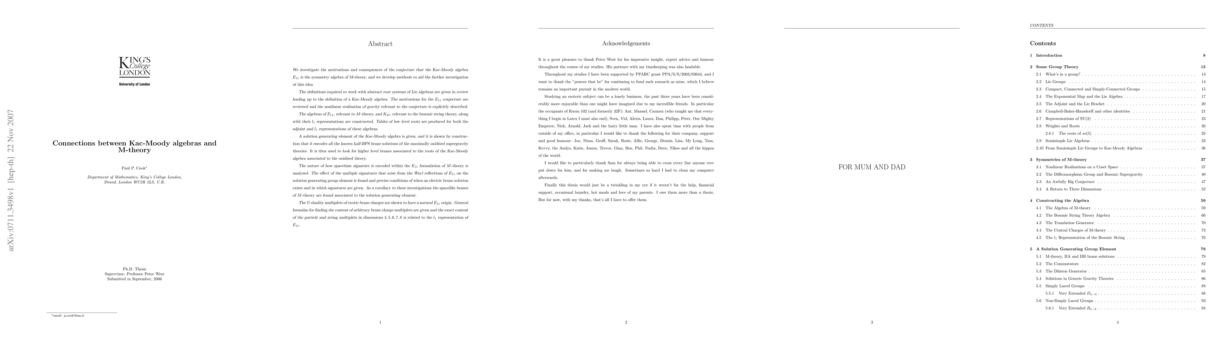 We investigate some of the motivations and consequences of the conjecture that the Kac-Moody algebra E11 is the symmetry algebra of M-theory, and we develop methods to aid the further investigation of this idea. The definitions required to work with abstract root systems of Lie algebras are given in review leading up to the definition of a Kac-Moody algebra. The motivations for the E11 conjecture are presented and the nonlinear realisation of gravity relevant to the conjecture is described. We give a beginner's guide to producing the algebras of E11, relevant to M-theory, and K27, relevant to the bosonic string theory, along with their l1 representations are constructed. Reference tables of low level roots are produced for both the adjoint and l1 representations of these algebras. In addition a particular group element, having a generic form for all G+++ algebras, is shown to encode all the half-BPS brane solutions of the maximally oxidised supergravities. Special analysis is given to the role of space-time signature in the context of this group element and subsequent to this analysis spacelike brane solutions are derived from the same solution generating group element. Finally the appearance of U-duality charge multiplets from E11 is reviewed. General formulae for finding the content of arbitrary brane charge multiplets are given and the content of the particle and string multiplets in dimensions 4,5,6,7 and 8 is shown to be contained in the l1 representation of E11.