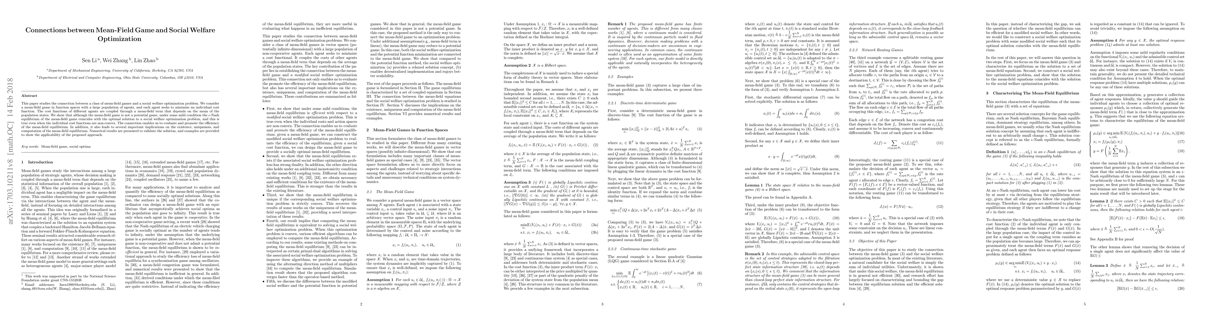 This paper studies the connection between a class of mean-field games and a social welfare optimization problem. We consider a mean-field game in function spaces with a large population of agents, and each agent seeks to minimize an individual cost function. The cost functions of different agents are coupled through a mean-field term that depends on the mean of the population states. We show that although the mean-field game is not a potential game, under some mild condition the $\epsilon$-Nash equilibrium of the mean-field game coincides with the optimal solution to a social welfare optimization problem, and this is true even when the individual cost functions are non-convex. The connection enables us to evaluate and promote the efficiency of the mean-field equilibrium. In addition, it also leads to several important implications on the existence, uniqueness, and computation of the mean-field equilibrium. Numerical results are presented to validate the solution, and examples are provided to show the applicability of the proposed approach.