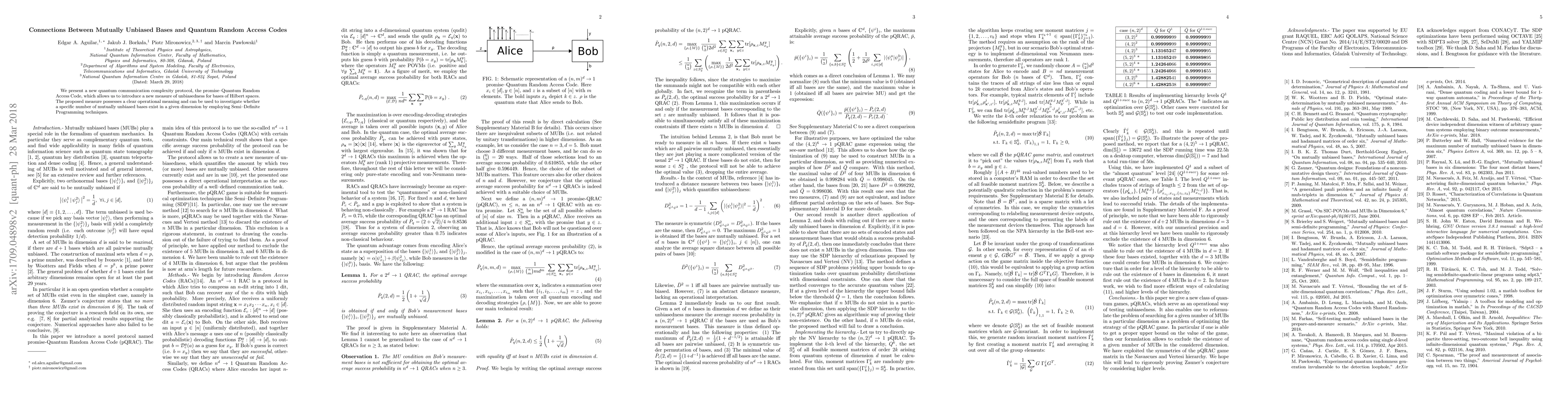We present a new quantum communication complexity protocol, the promise--Quantum Random Access Code, which allows us to introduce a new measure of unbiasedness for bases of Hilbert spaces. The proposed measure possesses a clear operational meaning and can be used to investigate whether a specific number of mutually unbiased bases exist in a given dimension by employing Semi--Definite Programming techniques.