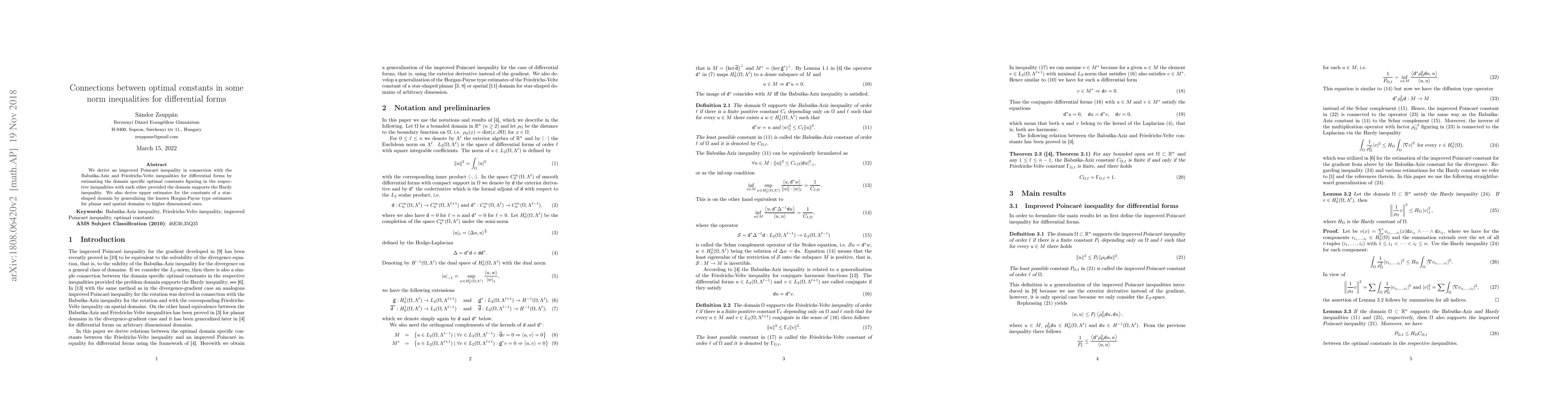 We derive an improved Poincar\'e inequality in connection with the Babu\v{s}ka-Aziz and Friedrichs-Velte inequalities for differential forms by estimating the domain specific optimal constants figuring in the respective inequalities with each other provided the domain supports the Hardy inequality. We also derive upper estimates for the constants of a star-shaped domain by generalizing the known Horgan-Payne type estimates for planar and spatial domains to higher dimensional ones.