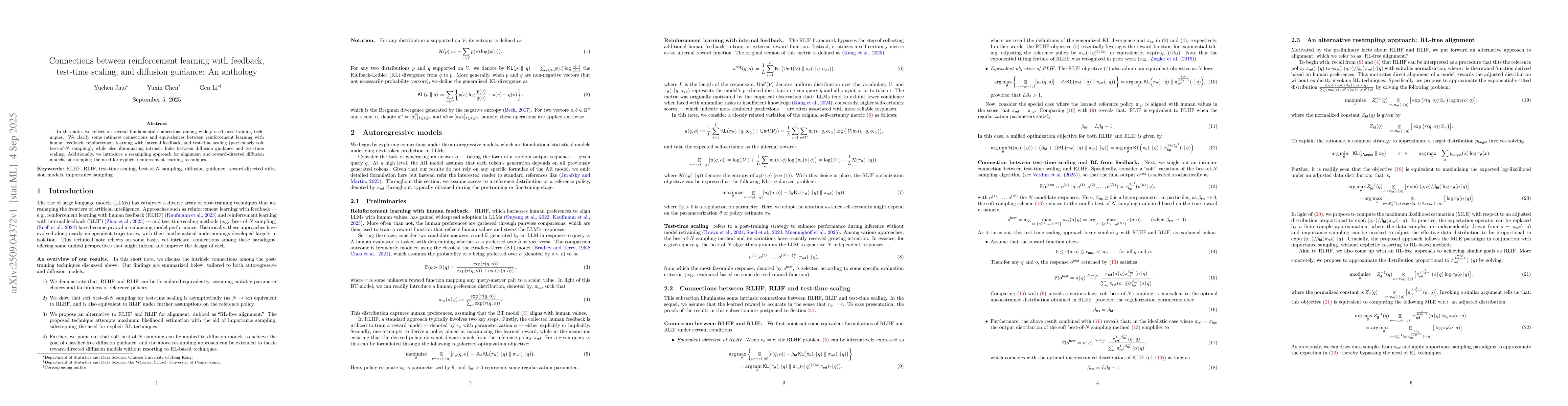 In this note, we reflect on several fundamental connections among widely used post-training techniques. We clarify some intimate connections and equivalences between reinforcement learning with human feedback, reinforcement learning with internal feedback, and test-time scaling (particularly soft best-of-$N$ sampling), while also illuminating intrinsic links between diffusion guidance and test-time scaling. Additionally, we introduce a resampling approach for alignment and reward-directed diffusion models, sidestepping the need for explicit reinforcement learning techniques.