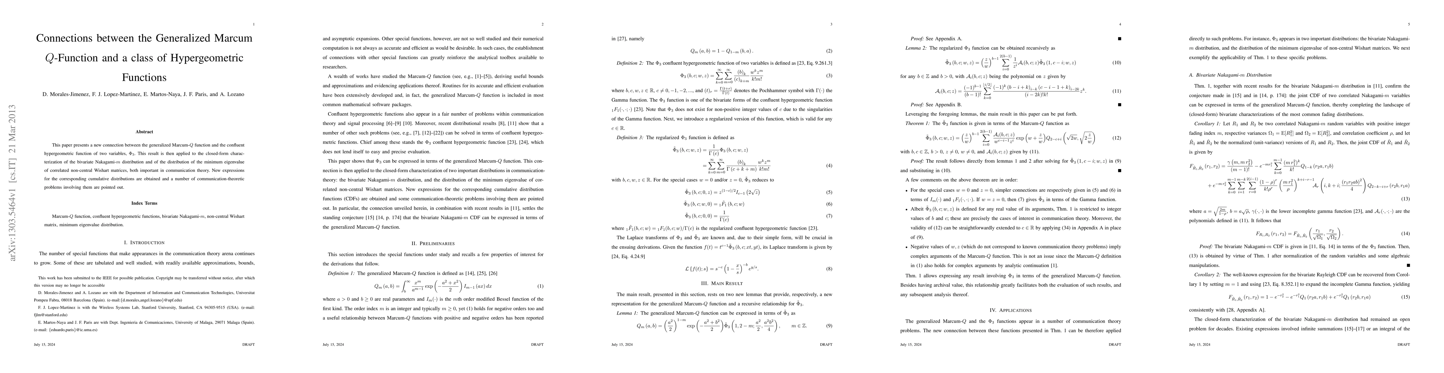 This paper establishes a novel link between the generalized Marcum-Q function and the confluent hypergeometric function of two variables, phi3, and applies it to characterize the bivariate Nakagami-m distribution and the minimum eigenvalue distribution of correlated non-central Wishart matrices, advancing communication theory.