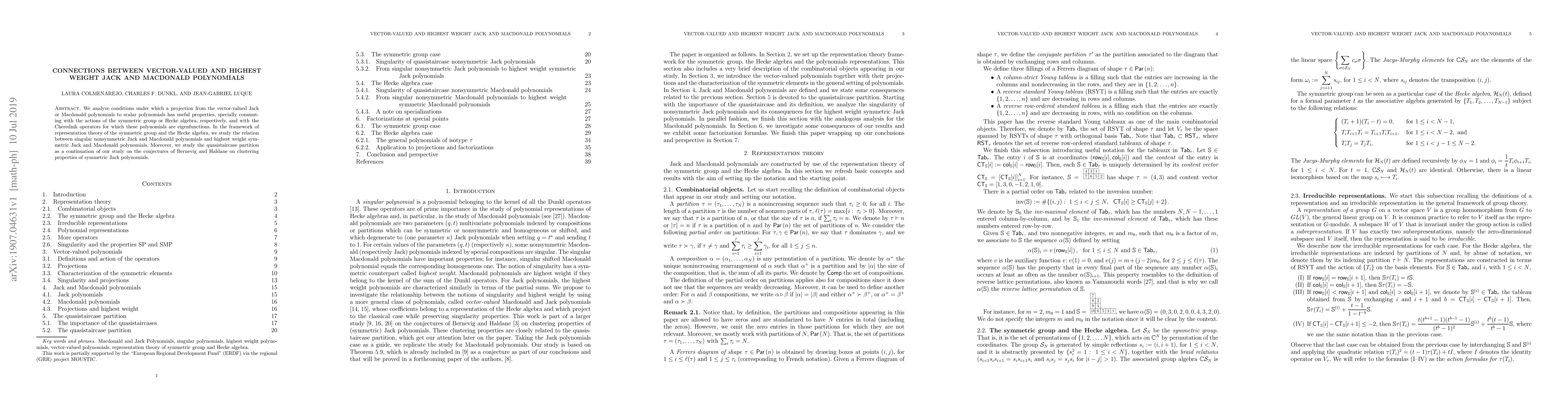We analyze conditions under which a projection from the vector-valued Jack or Macdonald polynomials to scalar polynomials has useful properties, especially commuting with the actions of the symmetric group or Hecke algebra, respectively, and with the Cherednik operators for which these polynomials are eigenfunctions. In the framework of the representation theory of the symmetric group and the Hecke algebra, we study the relation between singular nonsymmetric Jack and Macdonald polynomials and highest weight symmetric Jack and Macdonald polynomials. Moreover, we study the quasistaircase partition as a continuation of our study on the conjectures of Bernevig and Haldane on clustering properties of symmetric Jack polynomials.