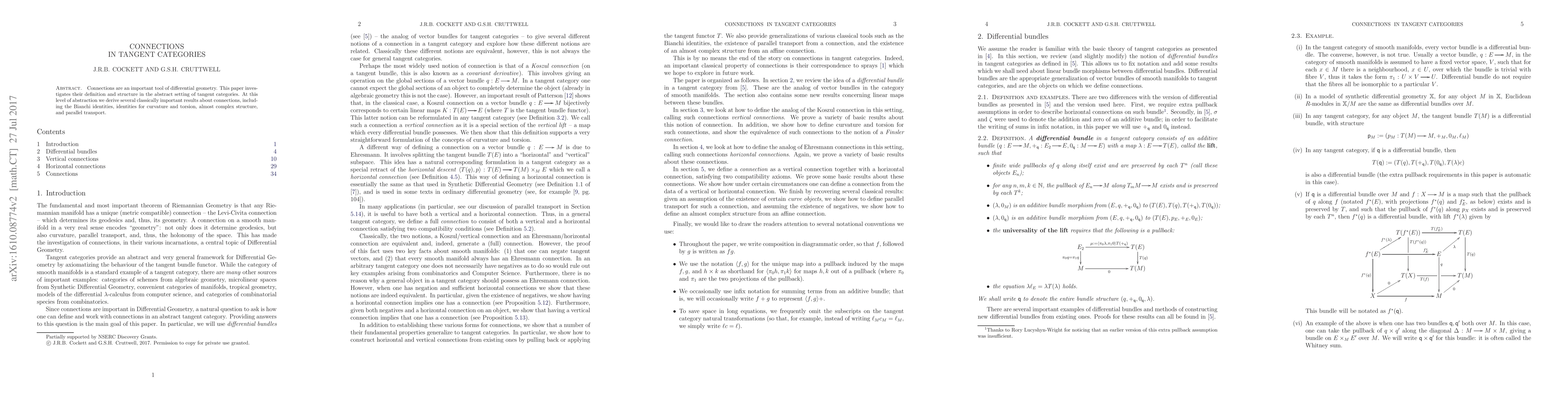 This paper investigates connections in tangent categories, deriving Bianchi identities and other results for curvature, torsion, complex structure, and parallel transport.