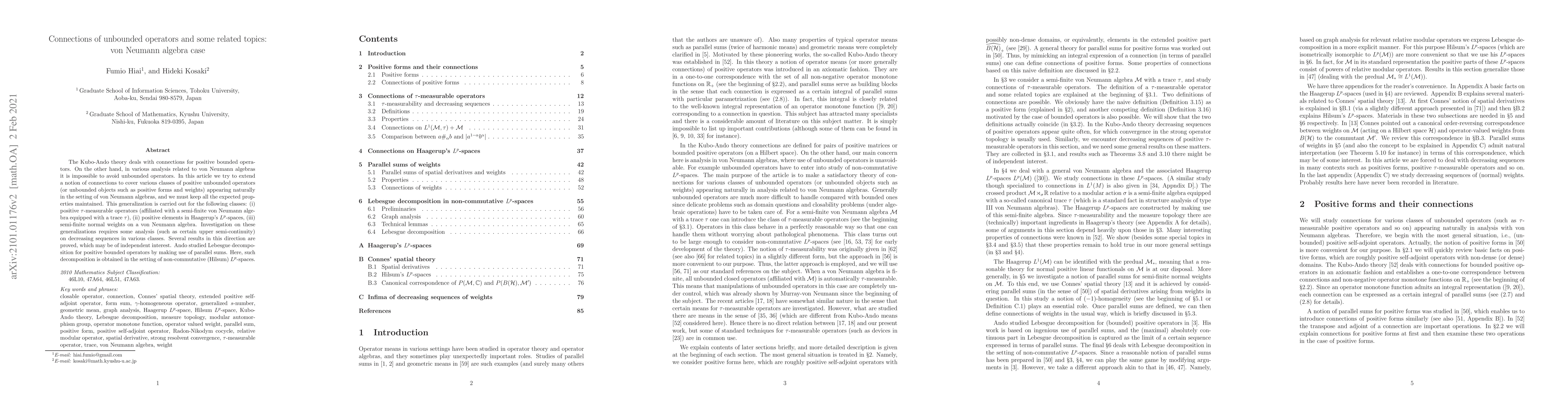 The Kubo-Ando theory deals with connections for positive bounded operators. On the other hand, in various analysis related to von Neumann algebras it is impossible to avoid unbounded operators. In this article we try to extend a notion of connections to cover various classes of positive unbounded operators (or unbounded objects such as positive forms and weights) appearing naturally in the setting of von Neumann algebras, and we must keep all the expected properties maintained. This generalization is carried out for the following classes: (i) positive $\tau$-measurable operators (affiliated with a semi-finite von Neumann algebra equipped with a trace $\tau$), (ii) positive elements in Haagerup's $L^p$-spaces, (iii) semi-finite normal weights on a von Neumann algebra. Investigation on these generalizations requires some analysis (such as certain upper semi-continuity) on decreasing sequences in various classes. Several results in this direction are proved, which may be of independent interest. Ando studied Lebesgue decomposition for positive bounded operators by making use of parallel sums. Here, such decomposition is obtained in the setting of non-commutative (Hilsum) $L^p$-spaces.