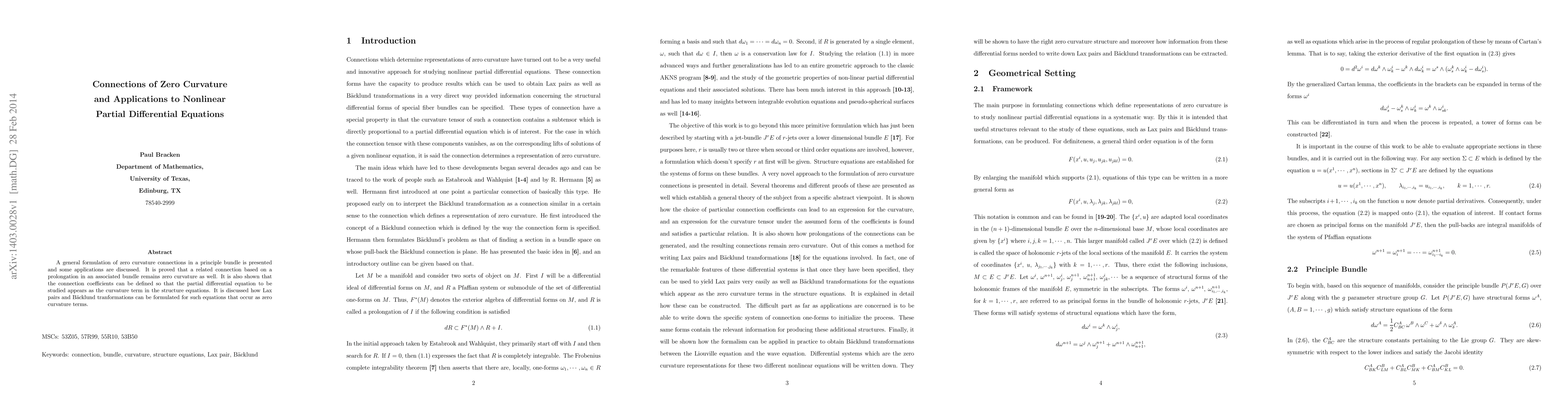 This paper formulates zero curvature connections in a principle bundle and demonstrates their application to nonlinear partial differential equations (PDEs). It shows that these connections maintain zero curvature and can be used to express PDEs as curvature terms, facilitating the formulation of Lax pairs and Backlund transformations.