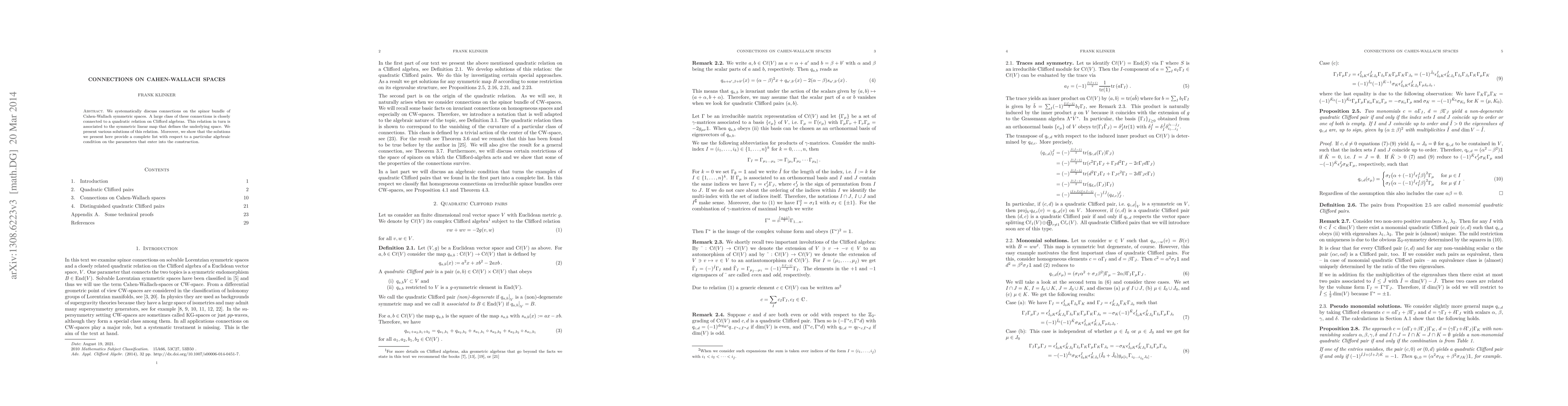 This paper explores connections on the spinor bundle of Cahen-Wallach symmetric spaces, linking them to quadratic relations on Clifford algebras defined by symmetric linear maps. It provides a complete list of solutions under specific algebraic conditions.