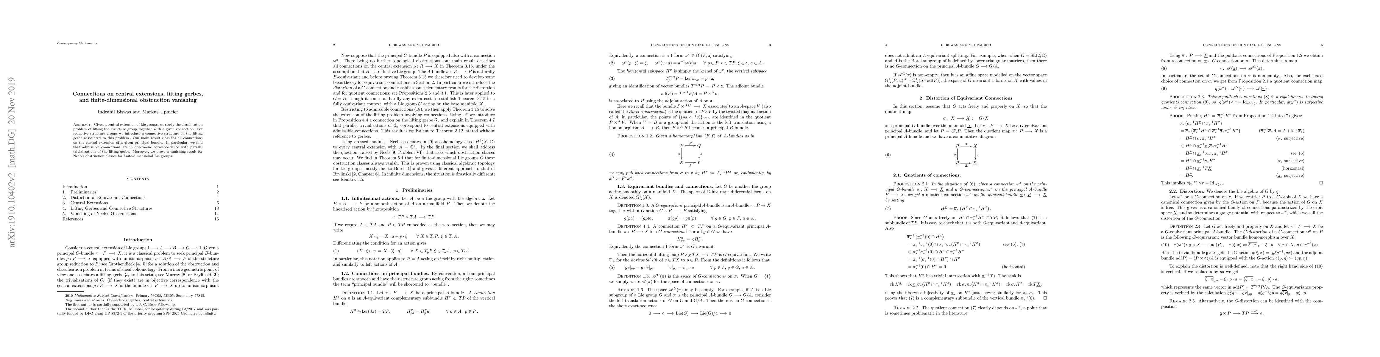 This paper classifies connections on central extensions of Lie groups, introducing a new connective structure on the lifting gerbe for reductive structure groups. It establishes a correspondence between admissible connections and parallel trivializations of the lifting gerbe, and proves the vanishing of Neeb's obstruction classes for finite-dimensional Lie groups.