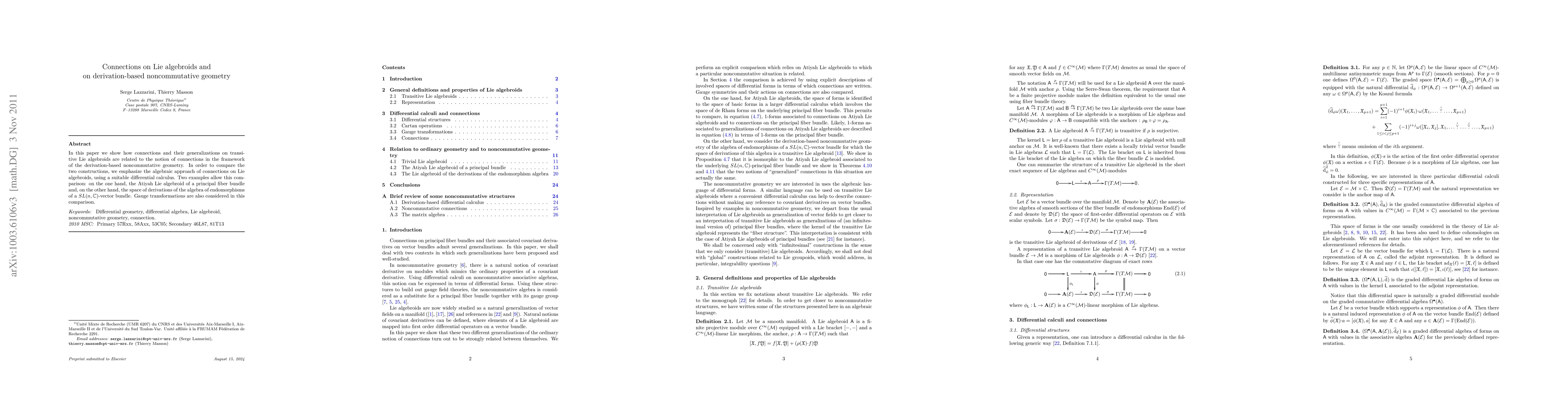 This paper explores the relationship between connections on transitive Lie algebroids and connections in derivation-based noncommutative geometry, using an algebraic approach and differential calculus. It compares these through examples involving the Atiyah Lie algebroid and derivations of endomorphisms of an $SL(n, \mathbb{C})$-vector bundle, while considering gauge transformations.