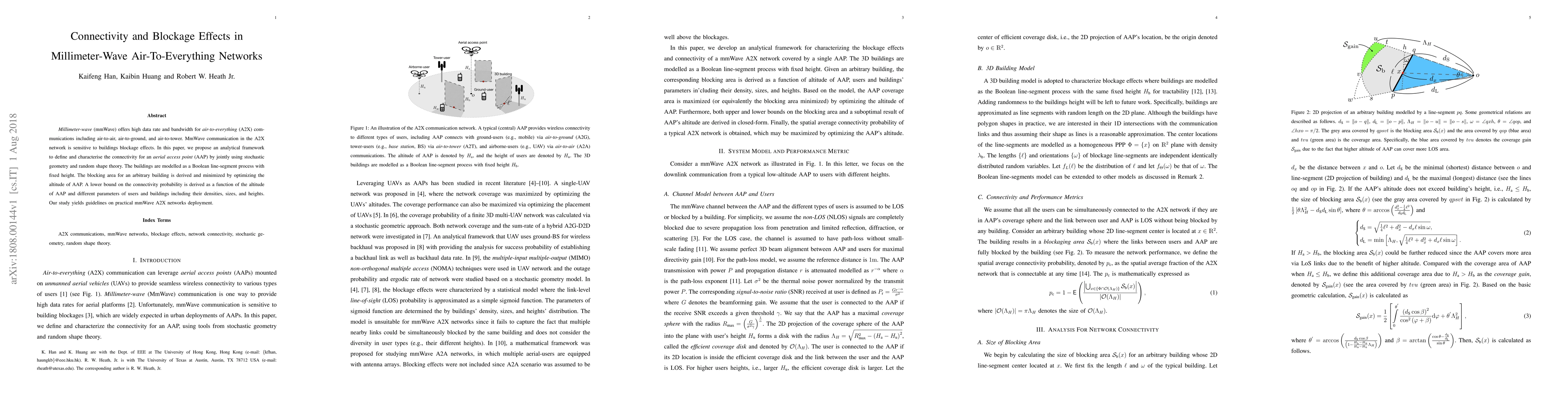 Millimeter-wave (mmWave) offers high data rate and bandwidth for air-to-everything (A2X) communications including air-to-air, air-to-ground, and air-to-tower. MmWave communication in the A2X network is sensitive to buildings blockage effects. In this paper, we propose an analytical framework to define and characterise the connectivity for an aerial access point (AAP) by jointly using stochastic geometry and random shape theory. The buildings are modelled as a Boolean line-segment process with fixed height. The blocking area for an arbitrary building is derived and minimized by optimizing the altitude of AAP. A lower bound on the connectivity probability is derived as a function of the altitude of AAP and different parameters of users and buildings including their densities, sizes, and heights. Our study yields guidelines on practical mmWave A2X networks deployment.
