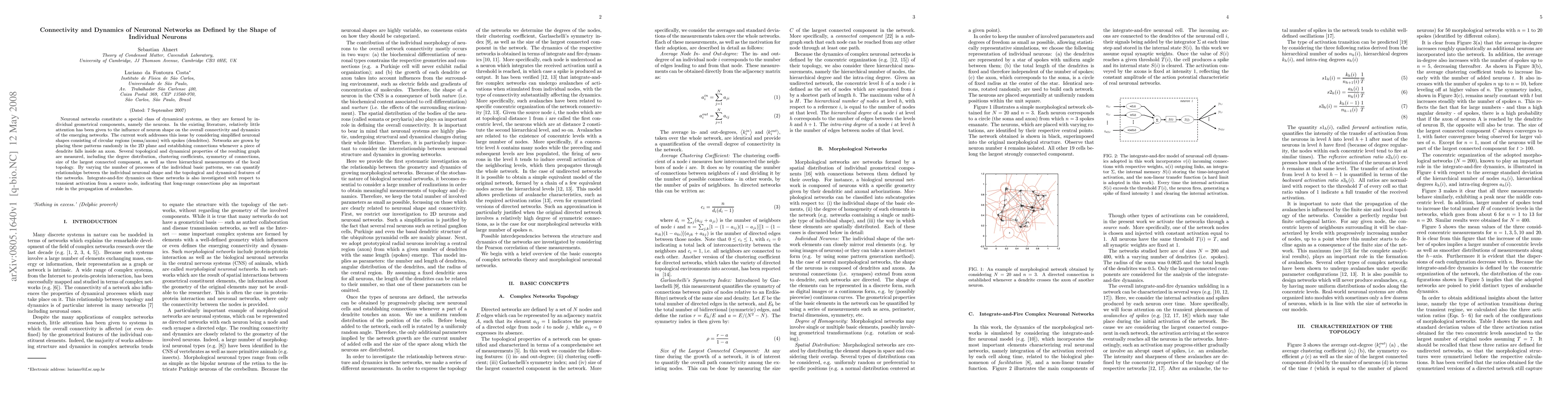 Neuronal networks constitute a special class of dynamical systems, as they are formed by individual geometrical components, namely the neurons. In the existing literature, relatively little attention has been given to the influence of neuron shape on the overall connectivity and dynamics of the emerging networks. The current work addresses this issue by considering simplified neuronal shapes consisting of circular regions (soma/axons) with spokes (dendrites). Networks are grown by placing these patterns randomly in the 2D plane and establishing connections whenever a piece of dendrite falls inside an axon. Several topological and dynamical properties of the resulting graph are measured, including the degree distribution, clustering coefficients, symmetry of connections, size of the largest connected component, as well as three hierarchical measurements of the local topology. By varying the number of processes of the individual basic patterns, we can quantify relationships between the individual neuronal shape and the topological and dynamical features of the networks. Integrate-and-fire dynamics on these networks is also investigated with respect to transient activation from a source node, indicating that long-range connections play an important role in the propagation of avalanches.
