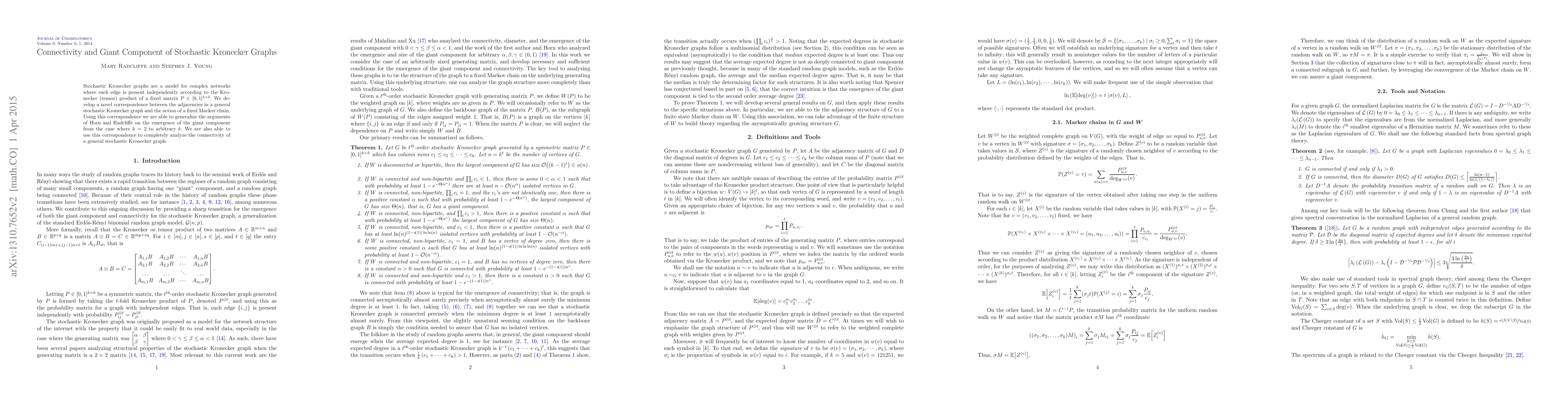Stochastic Kronecker graphs are a model for complex networks where each edge is present independently according the Kronecker (tensor) product of a fixed matrix k-by-k matrix P with entries in [0,1]. We develop a novel correspondence between the adjacencies in a general stochastic Kronecker graph and the action of a fixed Markov chain. Using this correspondence we are able to generalize the arguments of Horn and Radcliffe on the emergence of the giant component from the case where k = 2 to arbitrary k. We are also able to use this correspondence to completely analyze the connectivity of a general stochastic Kronecker graph.