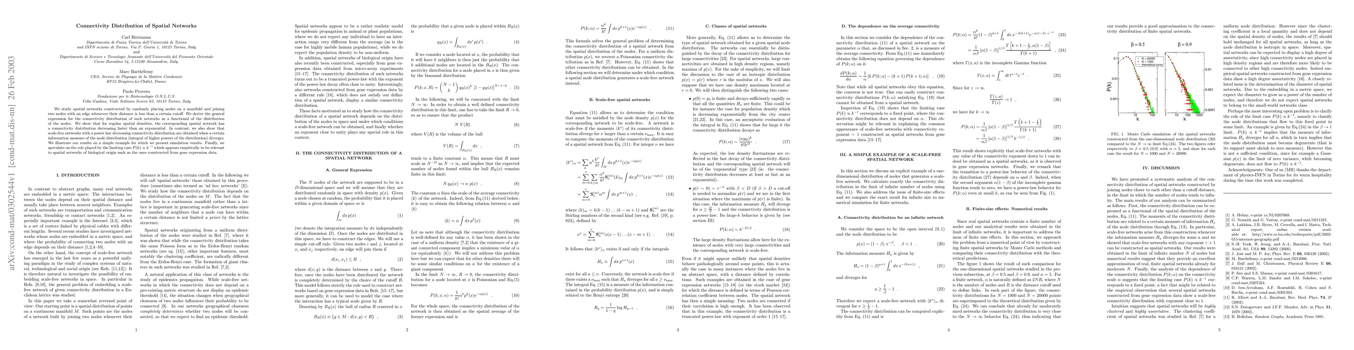 We study spatial networks constructed by randomly placing nodes on a manifold and joining two nodes with an edge whenever their distance is less than a certain cutoff. We derive the general expression for the connectivity distribution of such networks as a functional of the distribution of the nodes. We show that for regular spatial densities, the corresponding spatial network has a connectivity distribution decreasing faster than an exponential. In contrast, we also show that scale-free networks with a power law decreasing connectivity distribution are obtained when a certain information measure of the node distribution (integral of higher powers of the distribution) diverges. We illustrate our results on a simple example for which we present simulation results. Finally, we speculate on the role played by the limiting case P(k)=1/k which appears empirically to be relevant to spatial networks of biological origin such as the ones constructed from gene expression data.