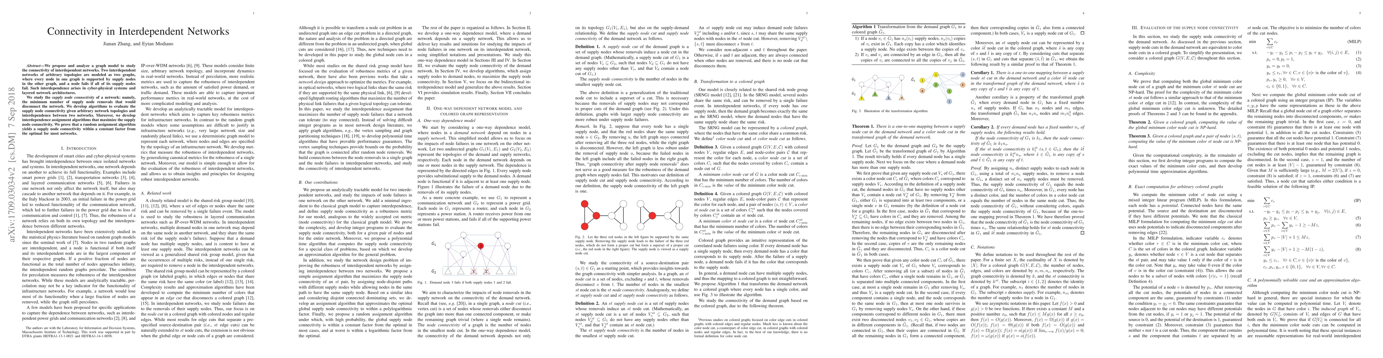 This paper proposes a graph model to analyze the connectivity of interdependent networks, focusing on the minimum number of supply node removals needed to disconnect the network. It develops algorithms to evaluate and maximize this "supply node connectivity" and proves that a random assignment algorithm is near-optimal for most networks.