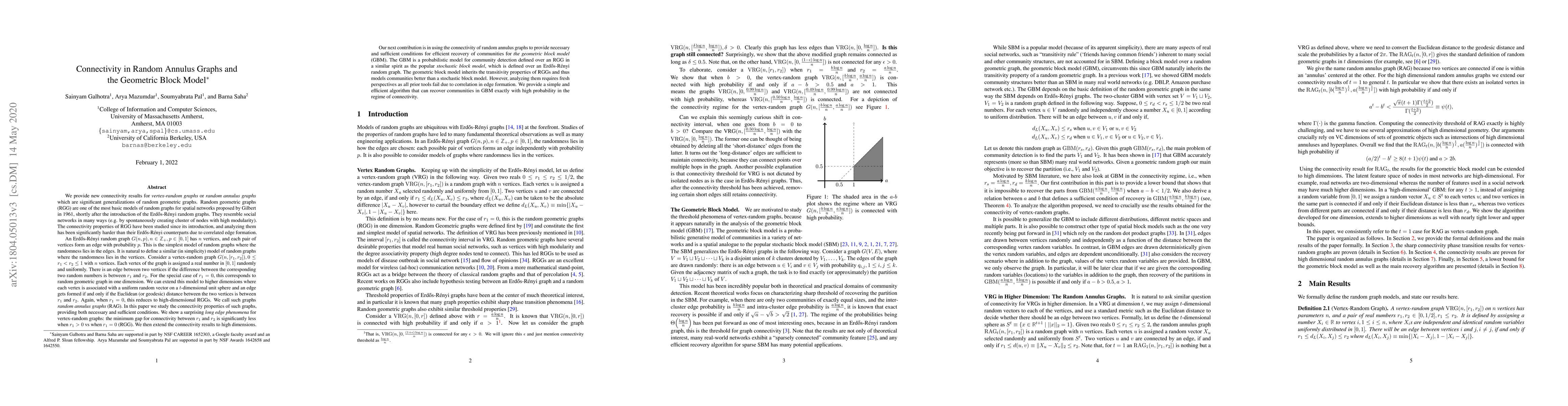 The paper provides new connectivity results for vertex-random graphs (VRG) or random annulus graphs, significant generalizations of random geometric graphs (RGG). It introduces necessary and sufficient conditions for efficient community recovery in the geometric block model (GBM), a probabilistic model for community detection defined over RGG.