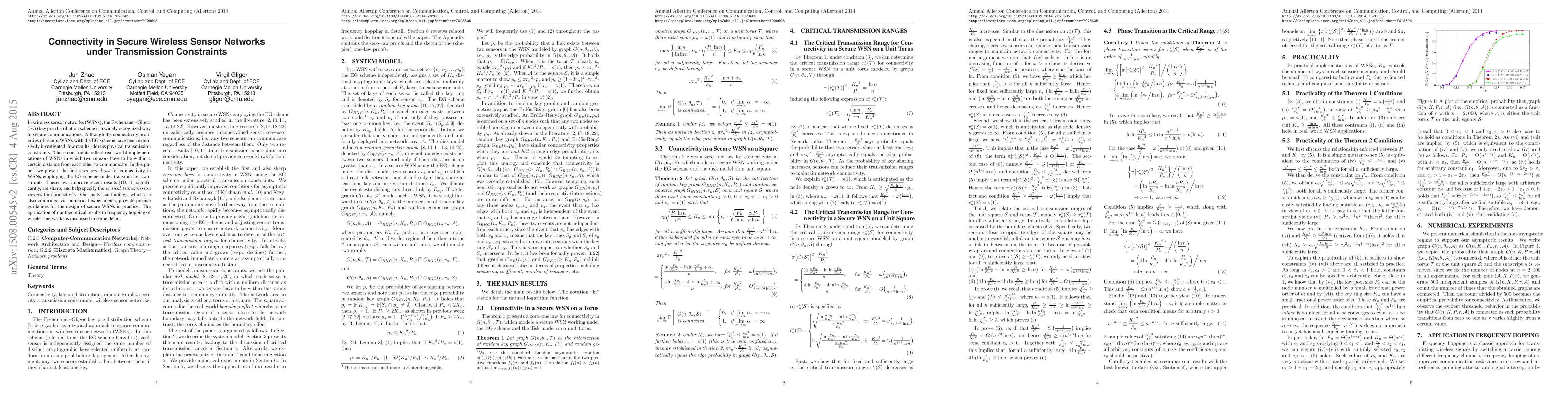 This paper investigates the connectivity properties of secure wireless sensor networks using the EG key pre-distribution scheme under physical transmission constraints. It presents zero-one laws to determine the critical transmission ranges for connectivity, validated through numerical experiments, and extends the theoretical results to frequency hopping in wireless networks.