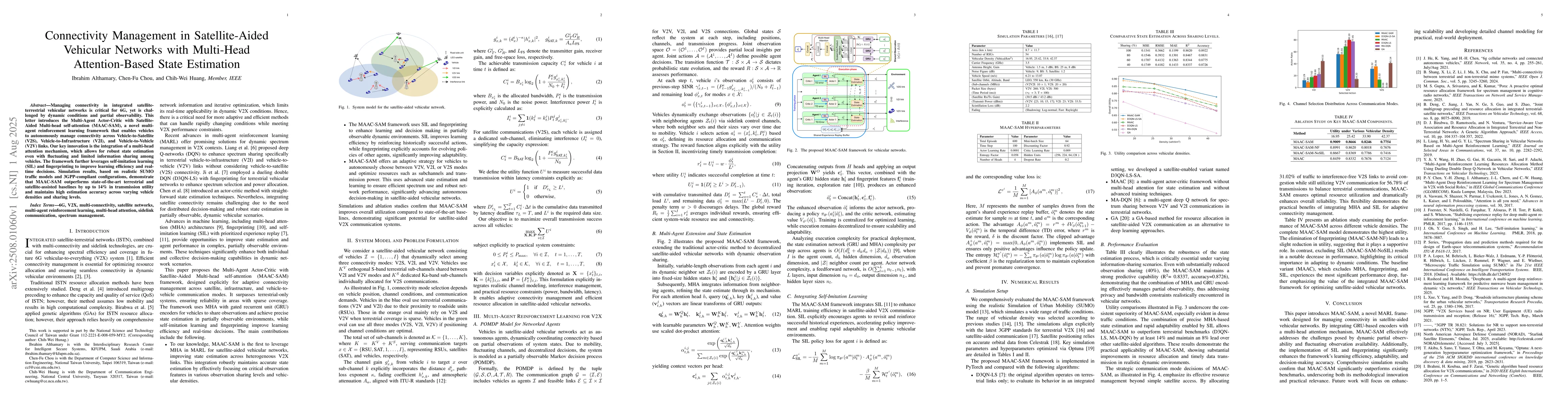Managing connectivity in integrated satellite-terrestrial vehicular networks is critical for 6G, yet is challenged by dynamic conditions and partial observability. This letter introduces the Multi-Agent Actor-Critic with Satellite-Aided Multi-head self-attention (MAAC-SAM), a novel multi-agent reinforcement learning framework that enables vehicles to autonomously manage connectivity across Vehicle-to-Satellite (V2S), Vehicle-to-Infrastructure (V2I), and Vehicle-to-Vehicle (V2V) links. Our key innovation is the integration of a multi-head attention mechanism, which allows for robust state estimation even with fluctuating and limited information sharing among vehicles. The framework further leverages self-imitation learning (SIL) and fingerprinting to improve learning efficiency and real-time decisions. Simulation results, based on realistic SUMO traffic models and 3GPP-compliant configurations, demonstrate that MAAC-SAM outperforms state-of-the-art terrestrial and satellite-assisted baselines by up to 14% in transmission utility and maintains high estimation accuracy across varying vehicle densities and sharing levels.