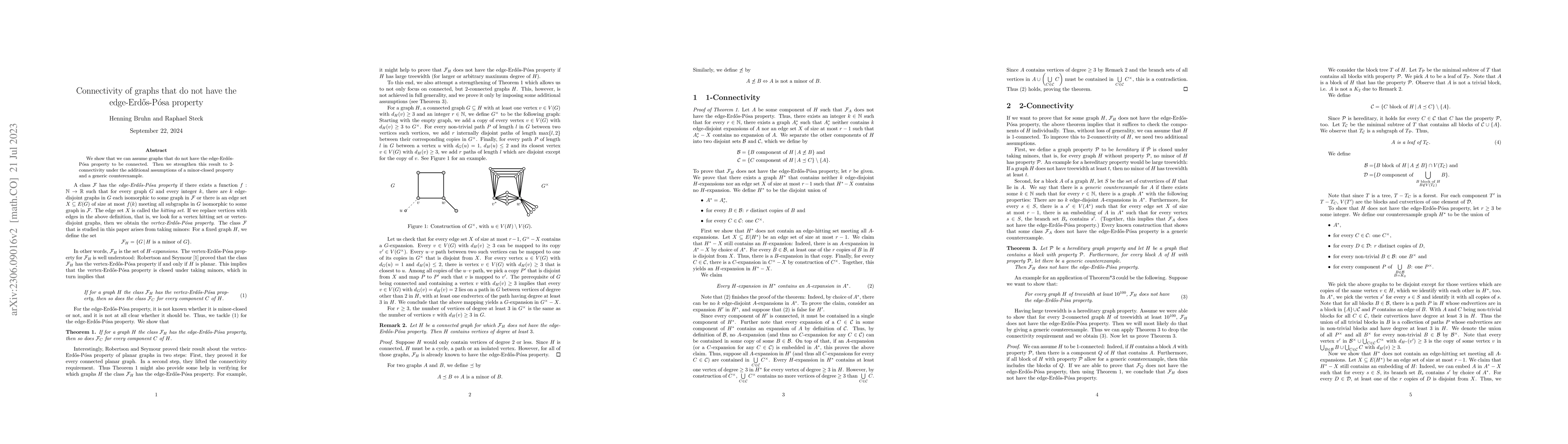 Summary: This paper demonstrates that graphs lacking the edge-Erdős-Pósa property are necessarily connected, and further shows that under specific minor-closed conditions, these graphs exhibit $2$-connectivity, meaning they remain connected even after removing any two edges.