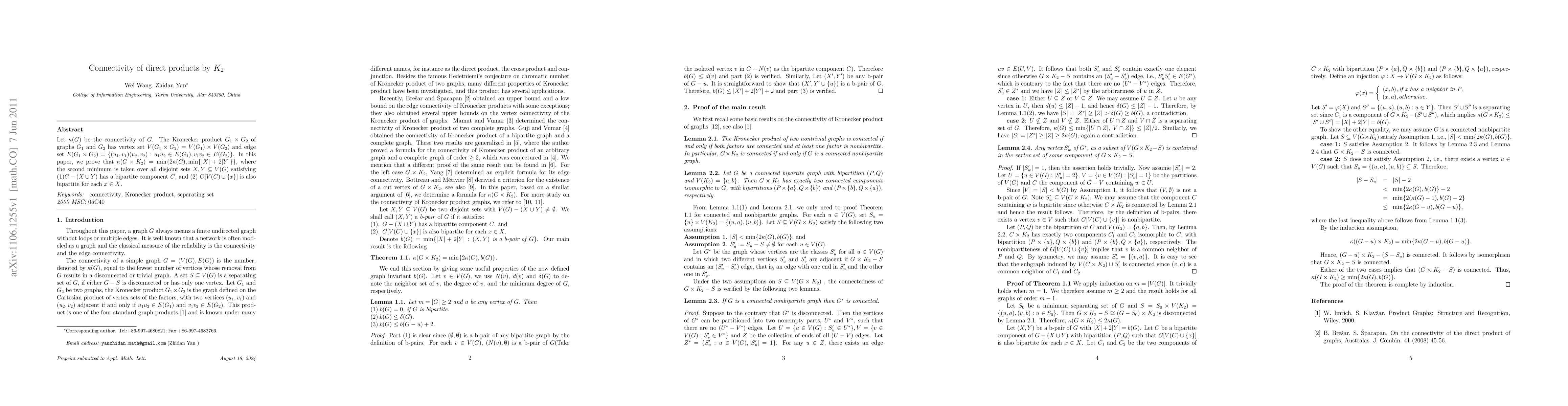 Let $\kappa(G)$ be the connectivity of $G$. The Kronecker product $G_1\times G_2$ of graphs $G_1$ and $G_2$ has vertex set $V(G_1\times G_2)=V(G_1)\times V(G_2)$ and edge set $E(G_1\times G_2)=\{(u_1,v_1)(u_2,v_2):u_1u_2\in E(G_1),v_1v_2\in E(G_2)\}$. In this paper, we prove that $\kappa(G\times K_2)=\textup{min}\{2\kappa(G), \textup{min}\{|X|+2|Y|\}\}$, where the second minimum is taken over all disjoint sets $X,Y\subseteq V(G)$ satisfying (1)$G-(X\cup Y)$ has a bipartite component $C$, and (2) $G[V(C)\cup \{x\}]$ is also bipartite for each $x\in X$.