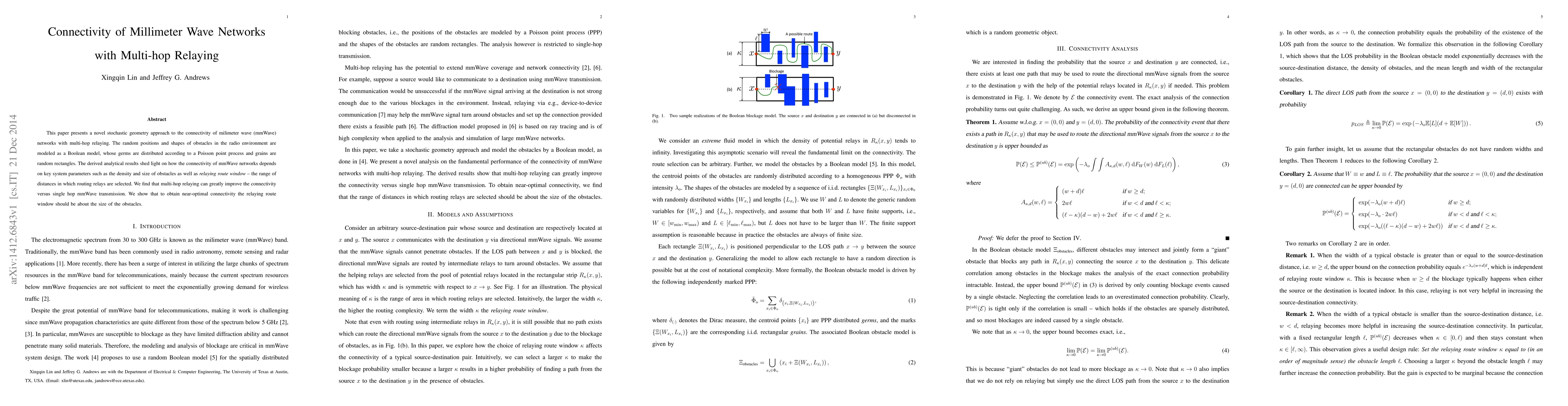 This paper presents a novel stochastic geometry approach to the connectivity of milimeter wave (mmWave) networks with multi-hop relaying. The random positions and shapes of obstacles in the radio environment are modeled as a Boolean model, whose germs are distributed according to a Poisson point process and grains are random rectangles. The derived analytical results shed light on how the connectivity of mmWave networks depends on key system parameters such as the density and size of obstacles as well as relaying route window -- the range of distances in which routing relays are selected. We find that multi-hop relaying can greatly improve the connectivity versus single hop mmWave transmission. We show that to obtain near-optimal connectivity the relaying route window should be about the size of the obstacles.