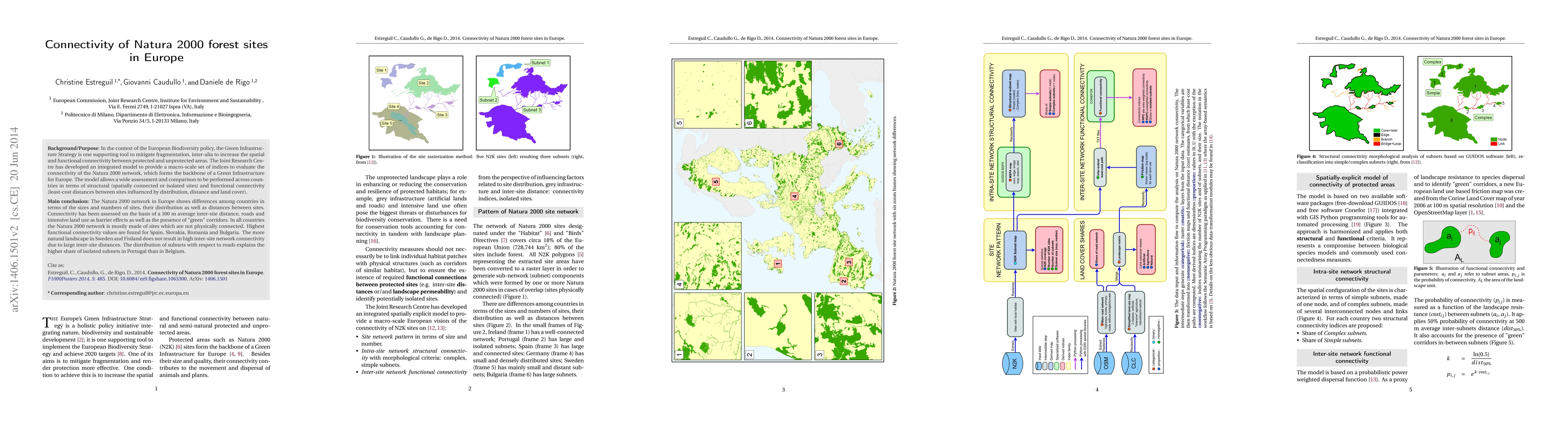 Background/Purpose: In the context of the European Biodiversity policy, the Green Infrastructure Strategy is one supporting tool to mitigate fragmentation, inter-alia to increase the spatial and functional connectivity between protected and unprotected areas. The Joint Research Centre has developed an integrated model to provide a macro-scale set of indices to evaluate the connectivity of the Natura 2000 network, which forms the backbone of a Green Infrastructure for Europe. The model allows a wide assessment and comparison to be performed across countries in terms of structural (spatially connected or isolated sites) and functional connectivity (least-cost distances between sites influenced by distribution, distance and land cover). Main conclusion: The Natura 2000 network in Europe shows differences among countries in terms of the sizes and numbers of sites, their distribution as well as distances between sites. Connectivity has been assessed on the basis of a 500 m average inter-site distance, roads and intensive land use as barrier effects as well as the presence of "green" corridors. In all countries the Natura 2000 network is mostly made of sites which are not physically connected. Highest functional connectivity values are found for Spain, Slovakia, Romania and Bulgaria. The more natural landscape in Sweden and Finland does not result in high inter-site network connectivity due to large inter-site distances. The distribution of subnets with respect to roads explains the higher share of isolated subnets in Portugal than in Belgium.