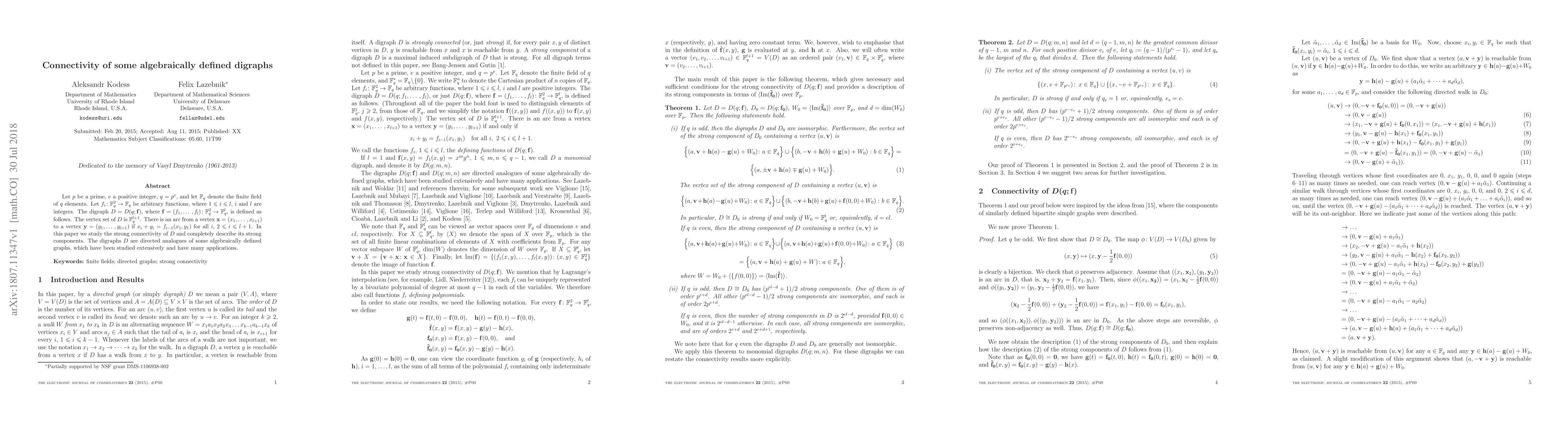 This paper examines the strong connectivity of algebraically defined digraphs $D(q;\bf{f})$ over finite fields $mathbb{F}_q$, where $q = p^e$ and $p$ is a prime. The digraphs are constructed using arbitrary functions $f_i : mathbb{F}_q^2 o mathbb{F}_q$. The research completely describes the strong components of these digraphs, offering insights into their connectivity properties, which have applications in areas where similar algebraically defined graphs have been useful.
