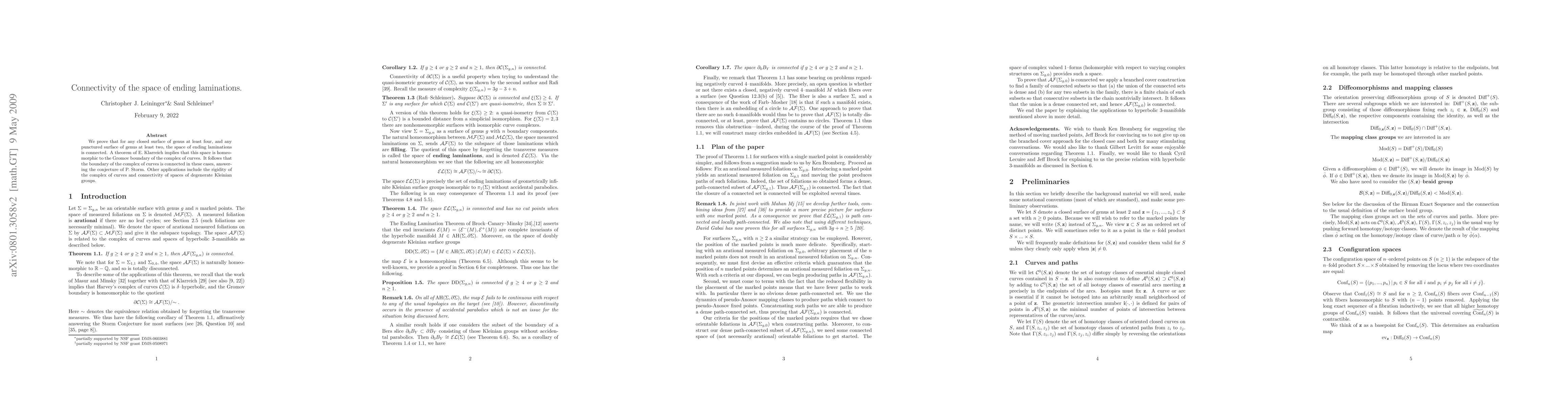 The paper proves the connectivity of the space of ending laminations for closed surfaces of genus at least four and punctured surfaces of genus at least two. This result implies the connectivity of the Gromov boundary of the complex of curves, addressing P. Storm's conjecture.